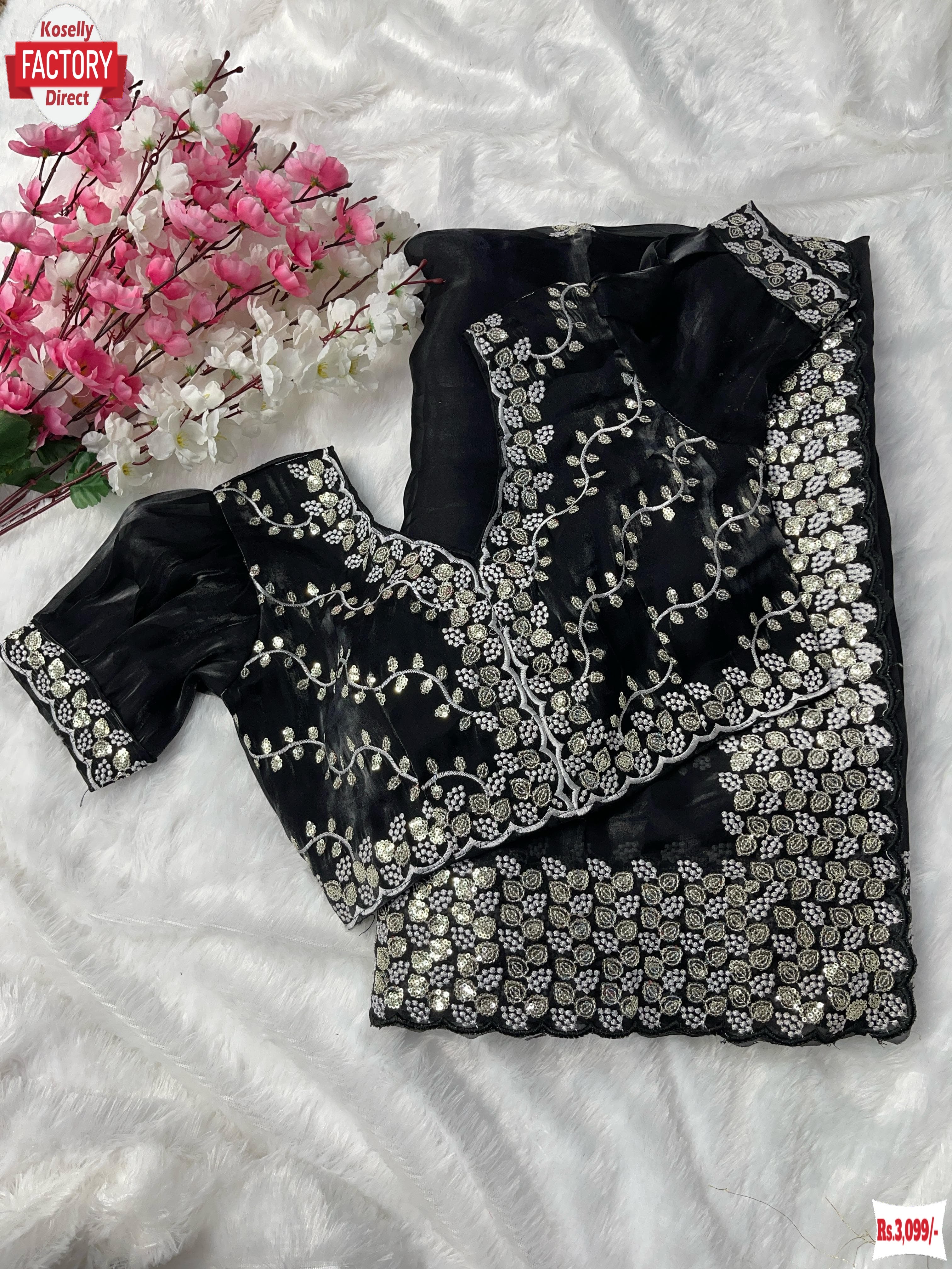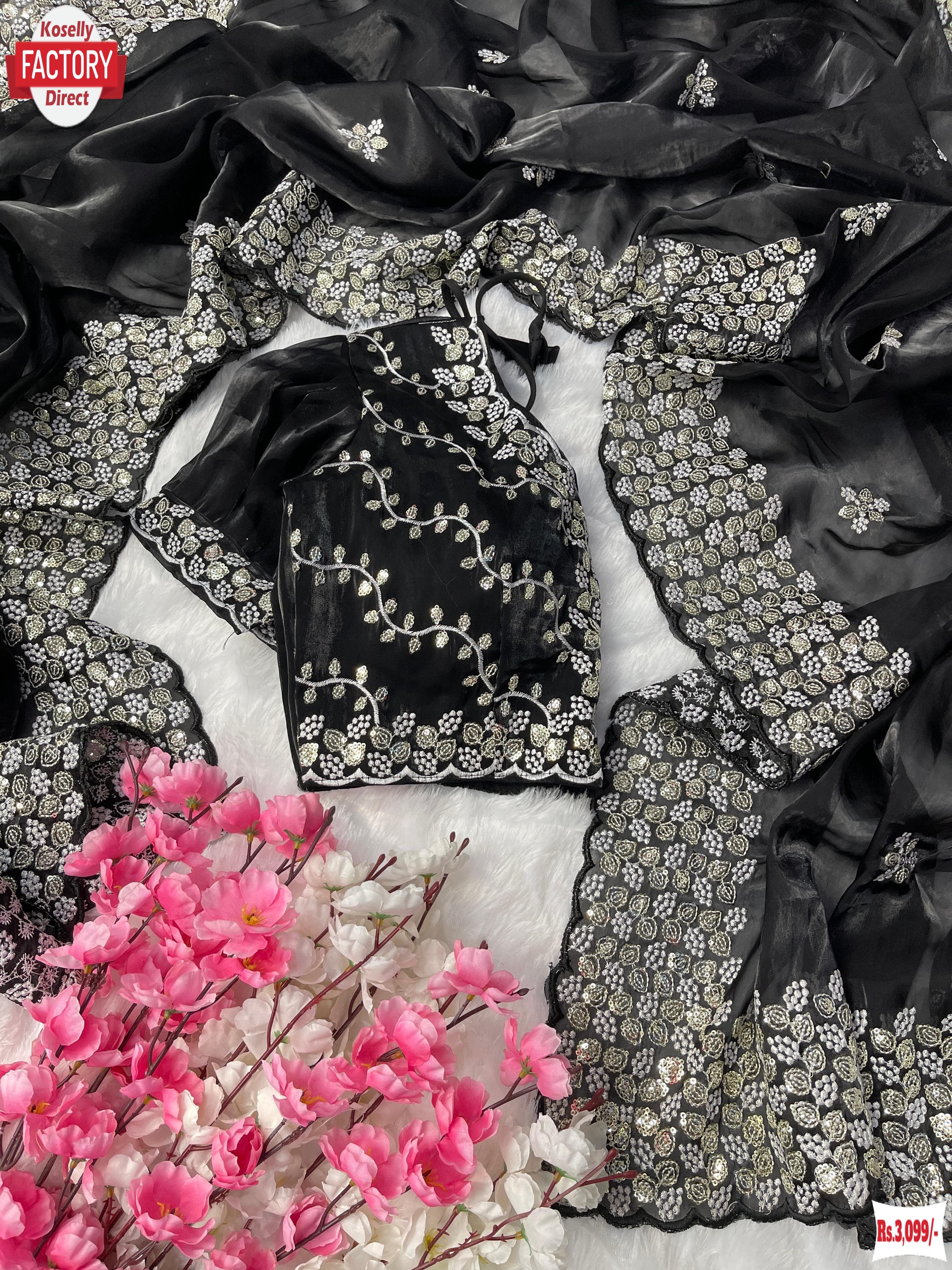 Black Pure Organza Silk Embroidered Partywear Saree