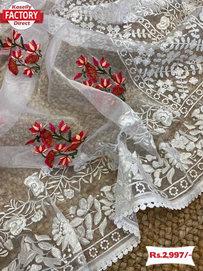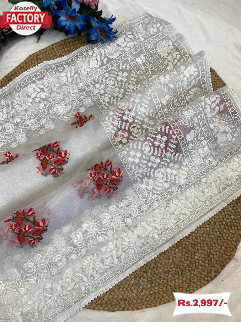 Designer White Organza Multi-thread Work Saree