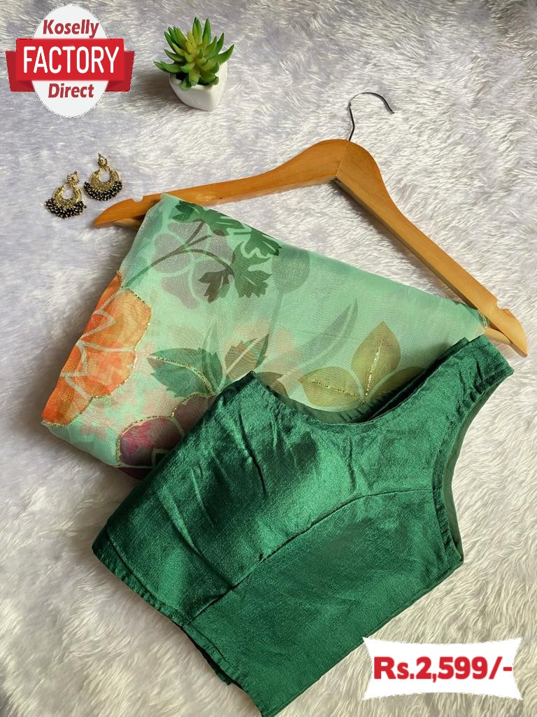 Soft pure organza handwork sarees with all over digital print with handwork (Khatli) work. Blouse : Bangalory satin un-stitched