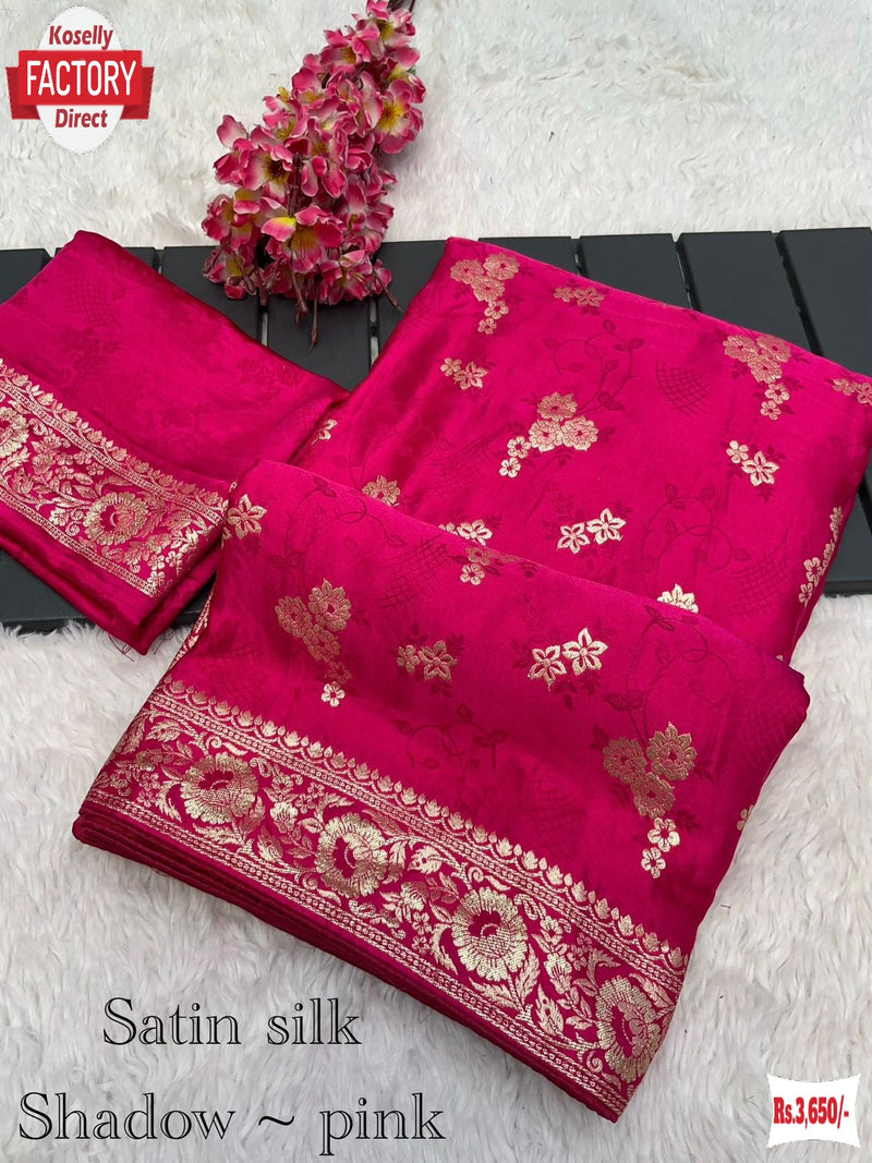 Add a pop of color to your wardrobe with our Hot Pink Satin Soft Silk Banarasi Weaving Saree! Made from high-quality satin silk, this saree features a heavy rich pallu weaving and shadow design, along with beautiful butti throughout. The running blouse has a Weaving shadow design, ready to be stitched. Stand out from the crowd with this stunning saree!