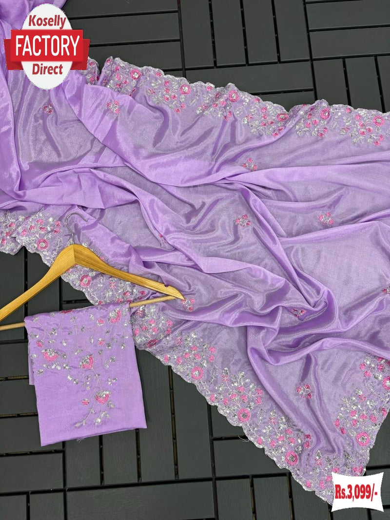 Lavender Chinnon Crepe Silk Embroidered Partywear Saree