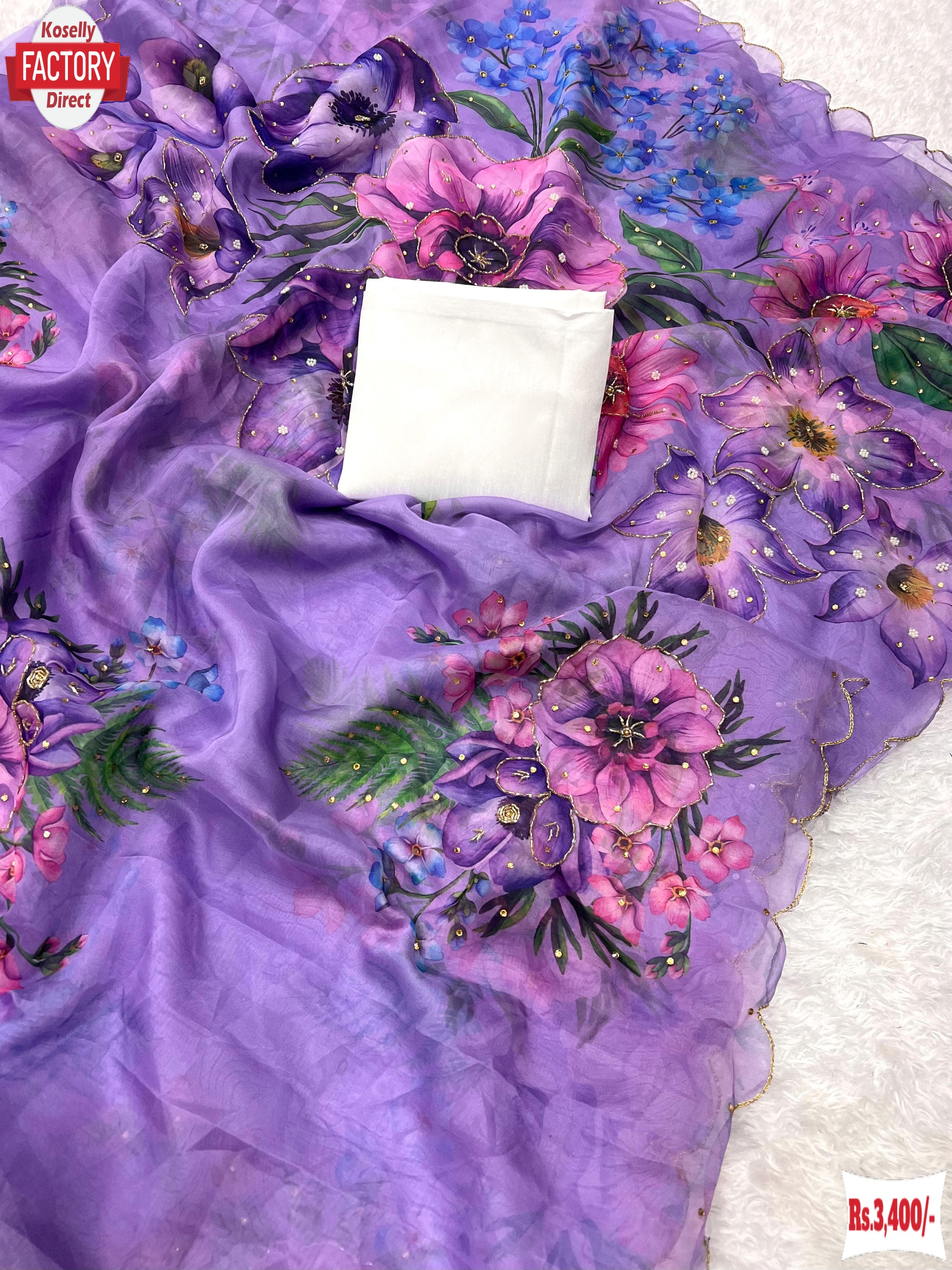 Lavender Pure Organza Tabby Silk Handwork Saree