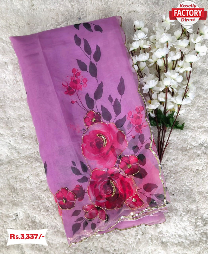 Mauve Purple Pure Organza 3D Print Saree With Handwork