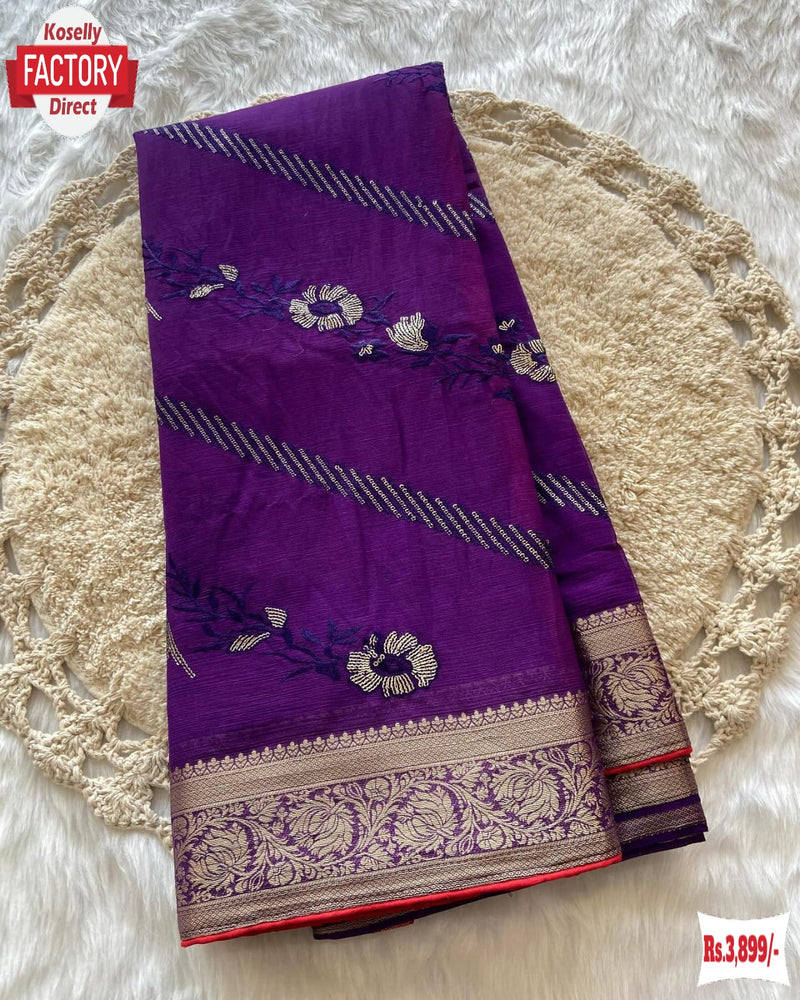 Elevate your style with our pure soft chiffon banarasi sequins embroidered saree. This lightweight chiffon saree boasts a stunning banarasi border and intricate embroidery for a touch of elegance. Comes with a contrasting chiffon blouse. Perfect for daily wear.