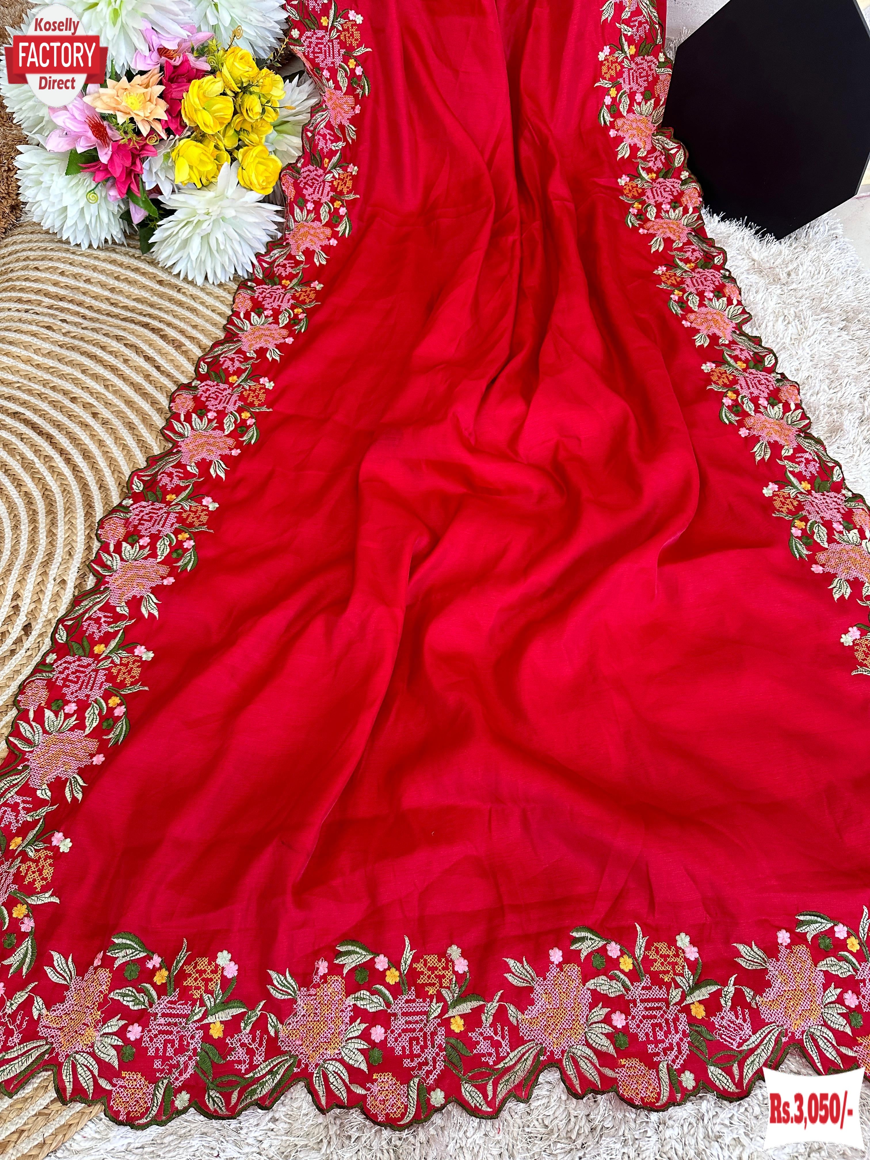 Red Tussar Silk Cross-stitch Embroidered Partywear Saree