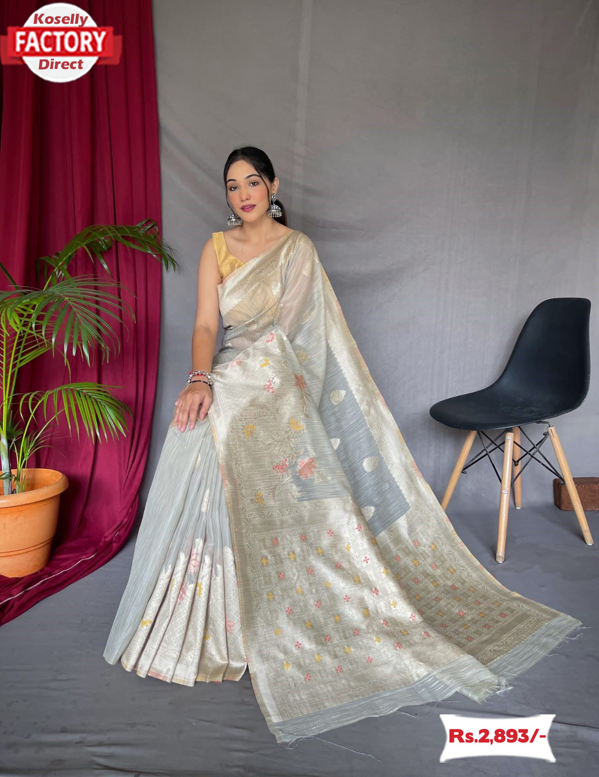 Pure LINEN SLUB silk saree with original zari weaving , EXCLUSIVE MEENA WORK CONTRAST rich pallu, BORDER .With all over Beautiful Motifs