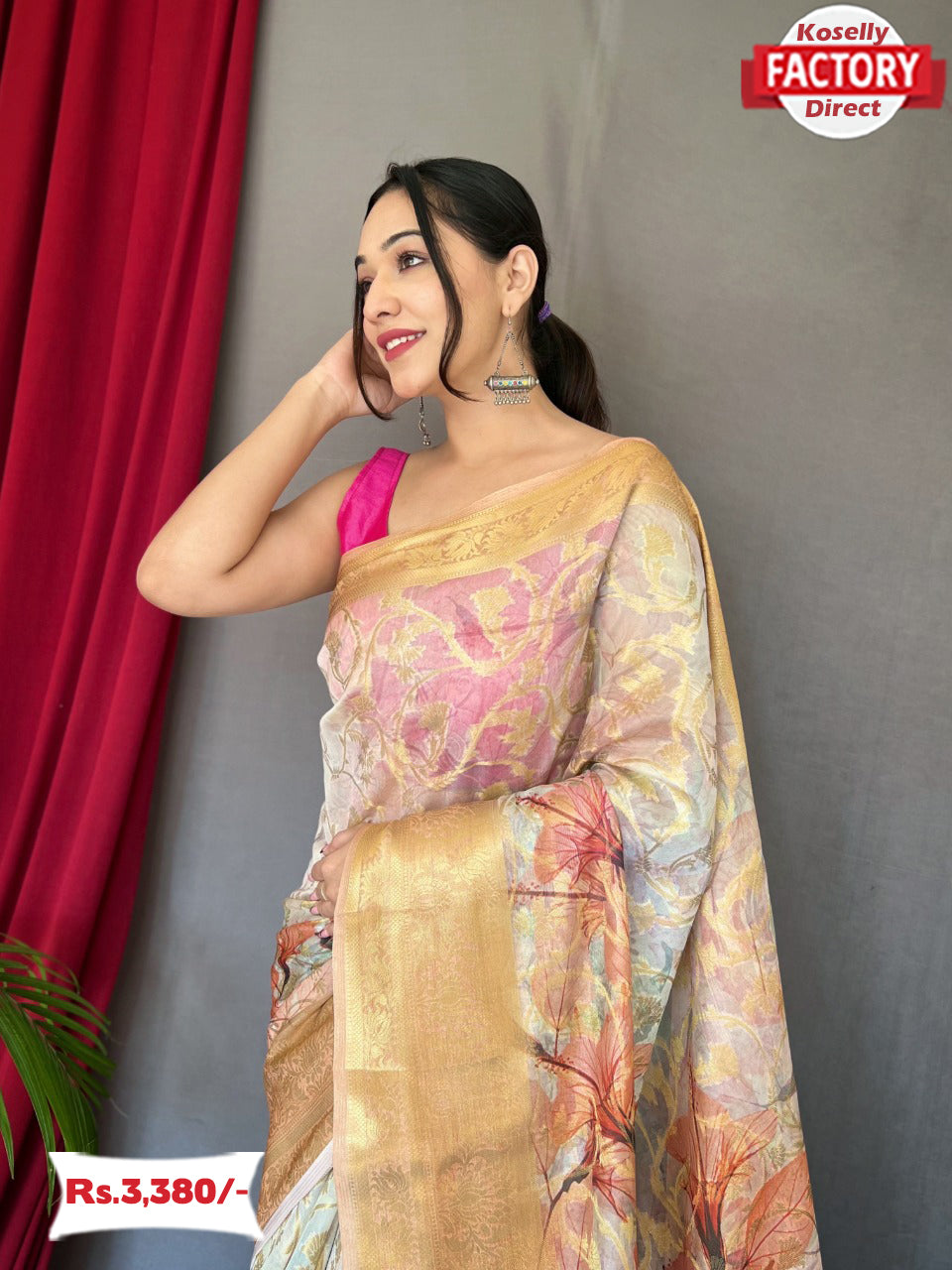 New concept of organza zari weaving saree with 8 inch gold zari weaved border with all over anokhi jaal design and rich weaved pallu with tassels attached, with a Touch of unique digital print concept.