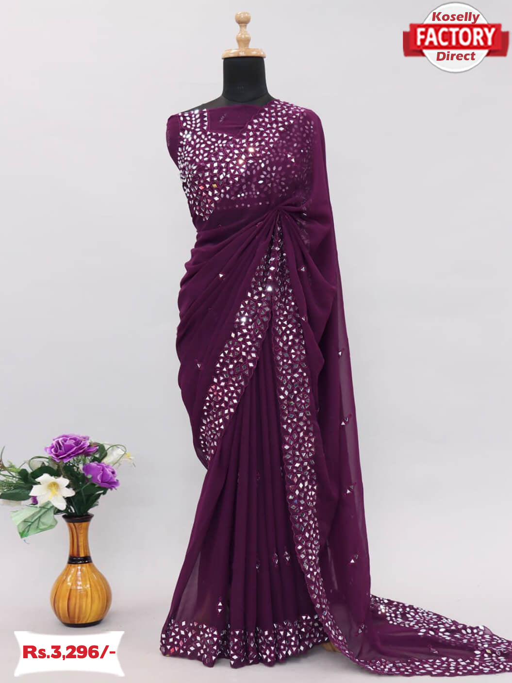 Superhit C Pallu Saree Embroidery Multi Work With Real Mirror Work Faux Georgette saree with banglori silk front and back both side worked blouse piece.