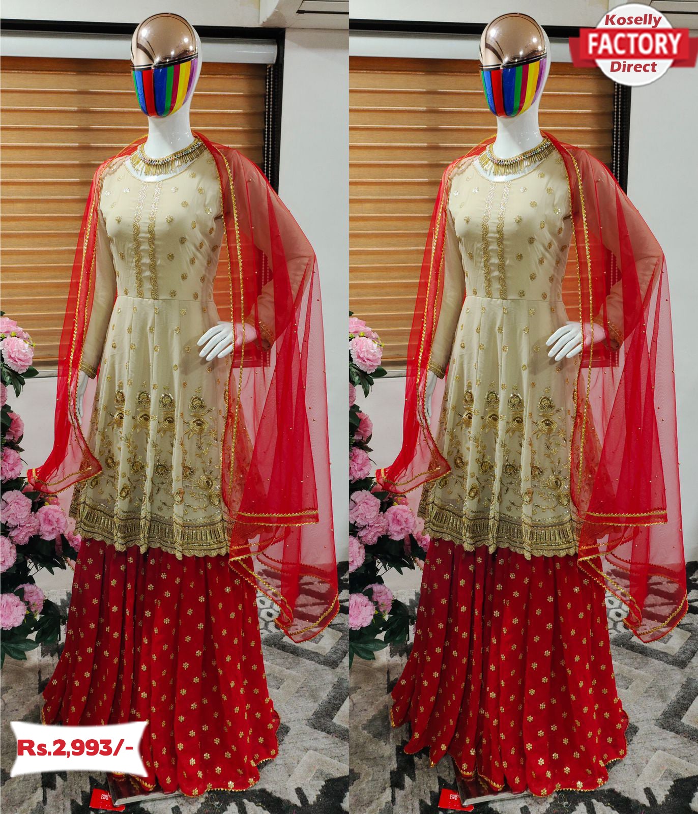 Heavily embroidered partywear kurtha sharara dress for ethnic styling at its best.