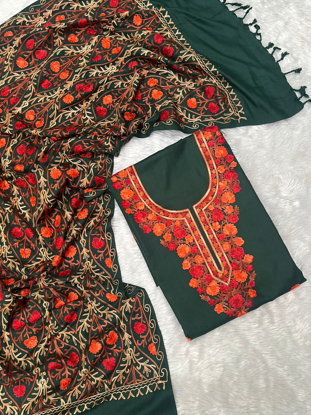 Dark Green Woolen Kurtha Piece With Kashmiri Embroidery Work
