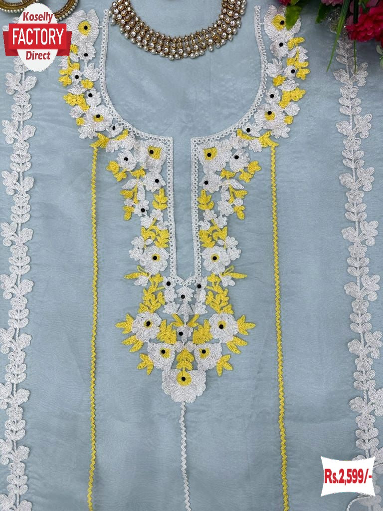 Light Blue Soft Organza Embroidered Kurtha Suruwal Piece
