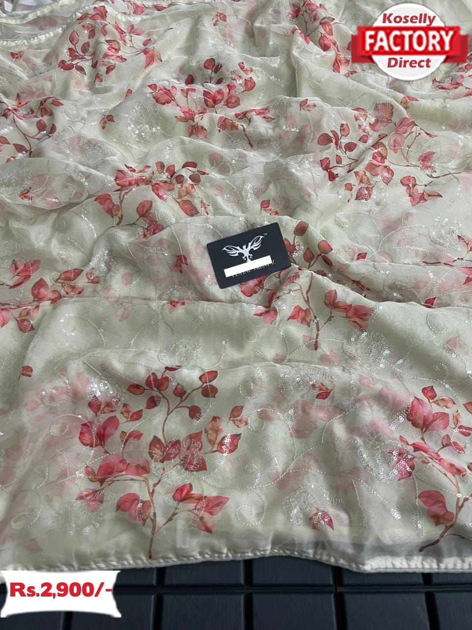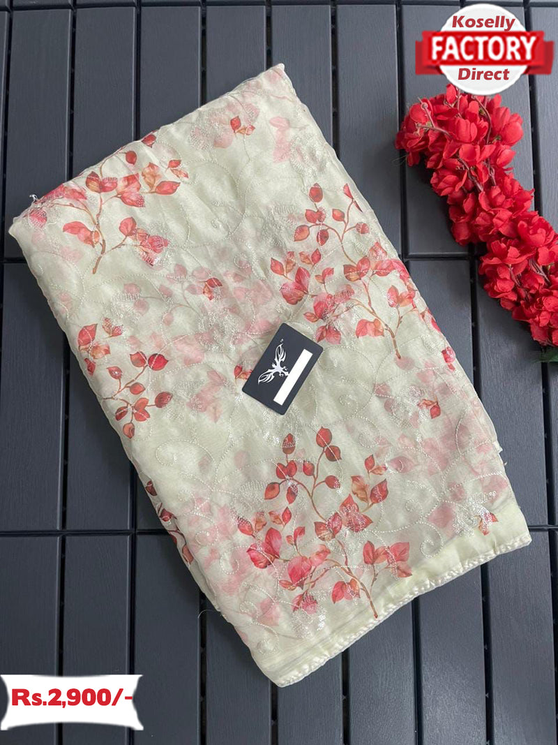 Pure Tabby silk saree having beautiful floral print and water sequins embroidery. Comes with heavy banglori satin UN-stitched silk blouse.
