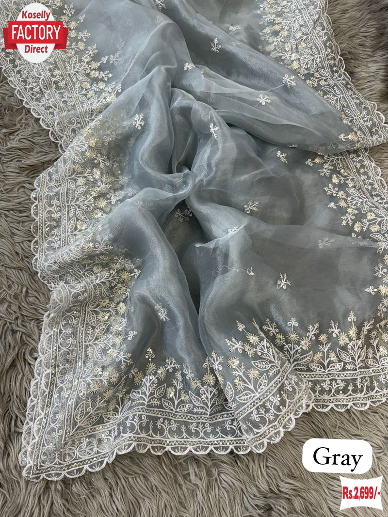 Grey Pure Organza Sequins And Thread Work Partywear Saree