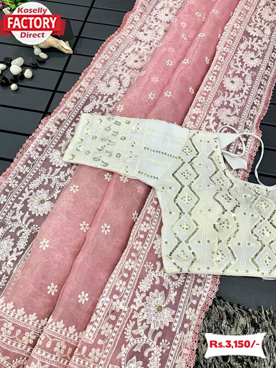 Pink Organza Chikankari Saree With Readymade Blouse