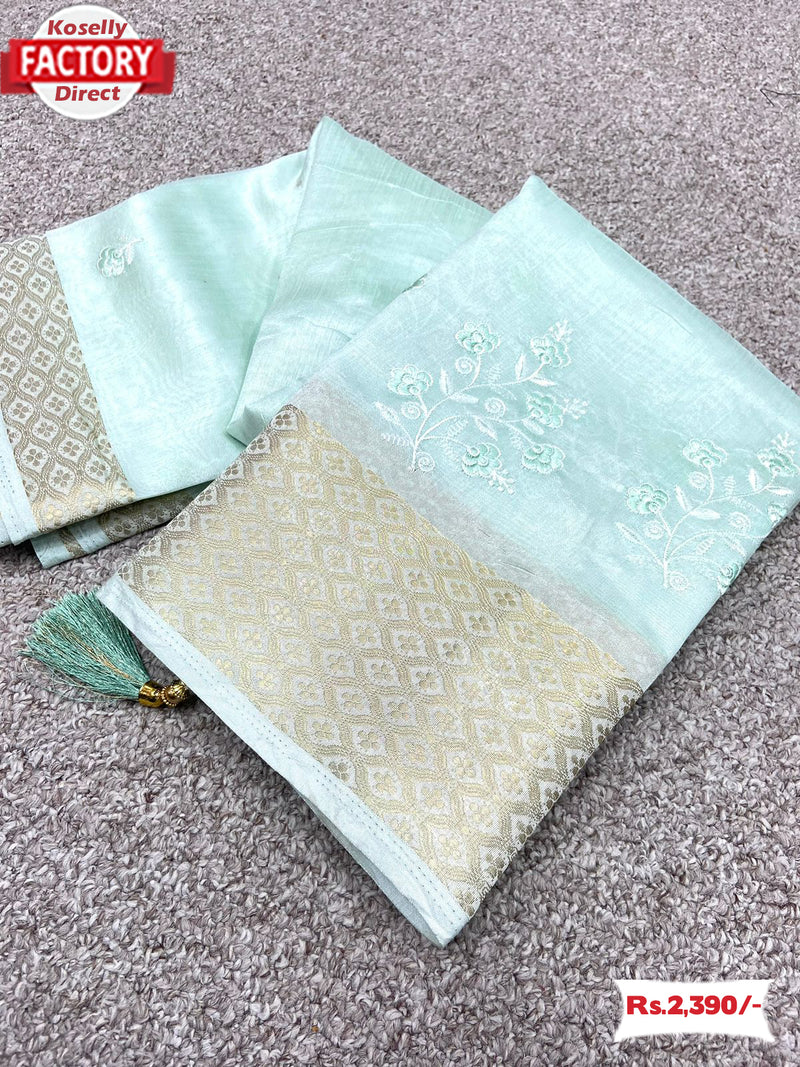 Sea Blue Cotton Embroidered Saree With Banarasi Border