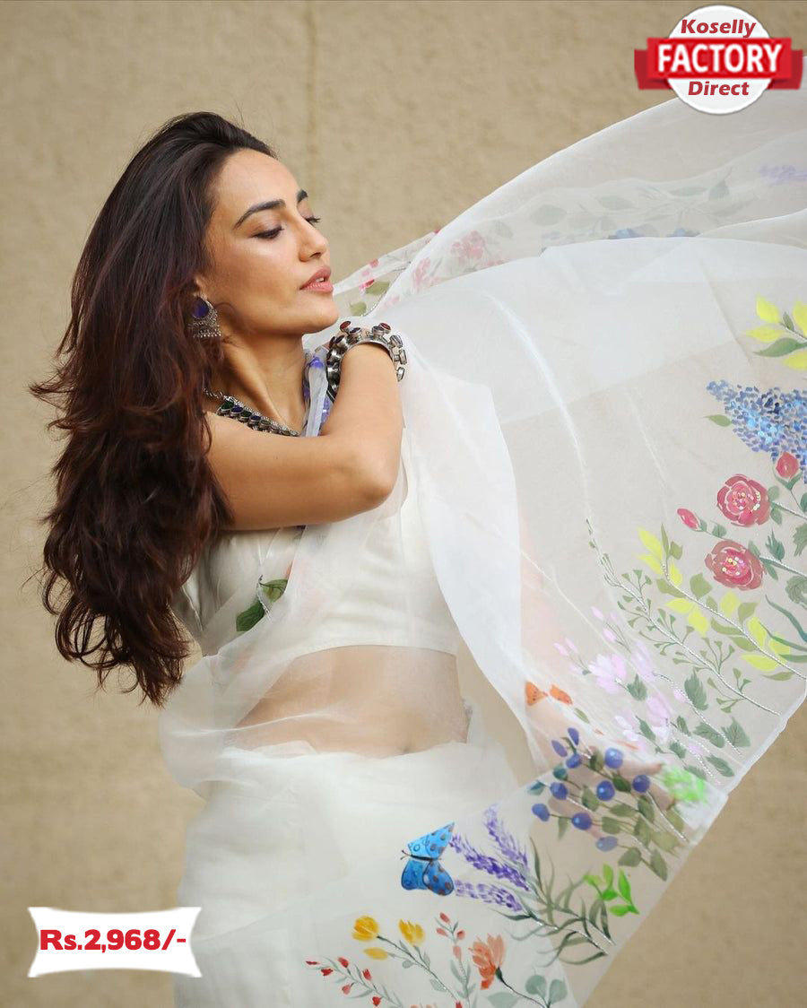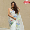 Pure organza silk saree with elegant prints and tikli work all ovee saree with attractive tassels for a luxurious look and feel.