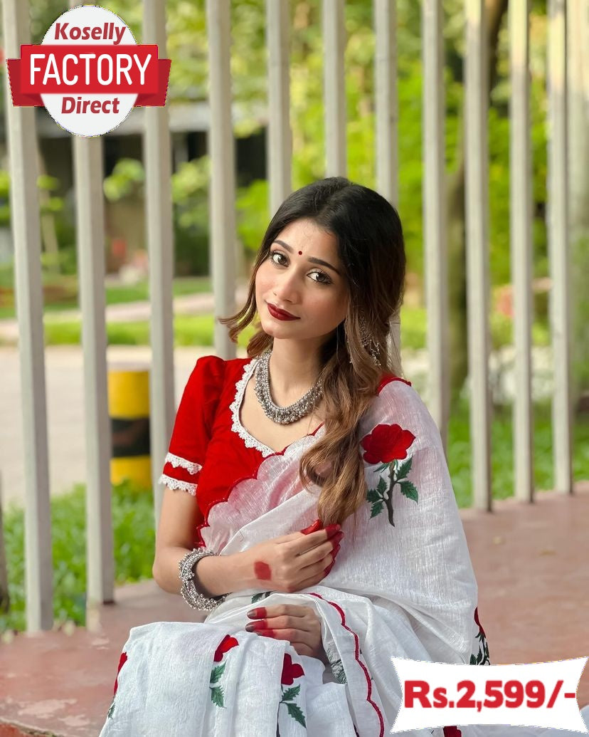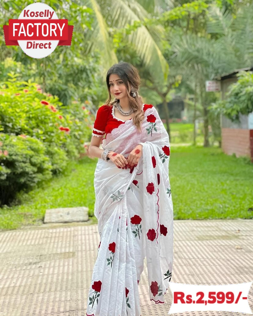 White Pure Chanderi Cotton Rose Embroidered Saree