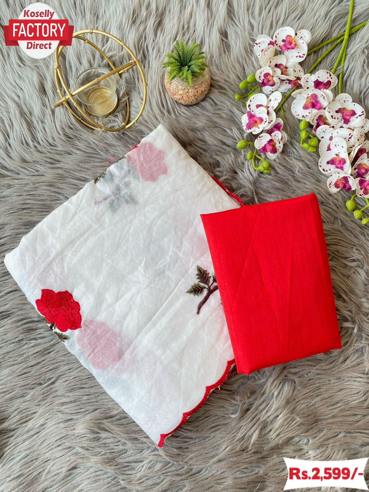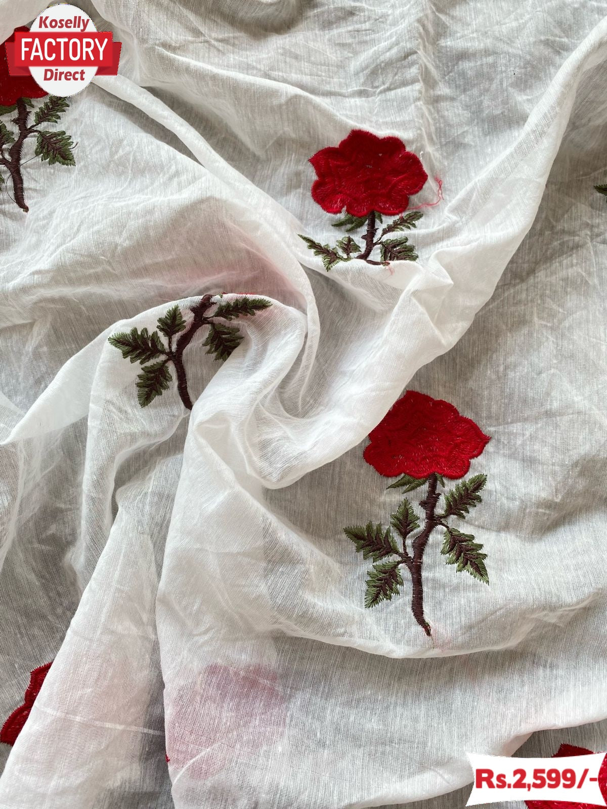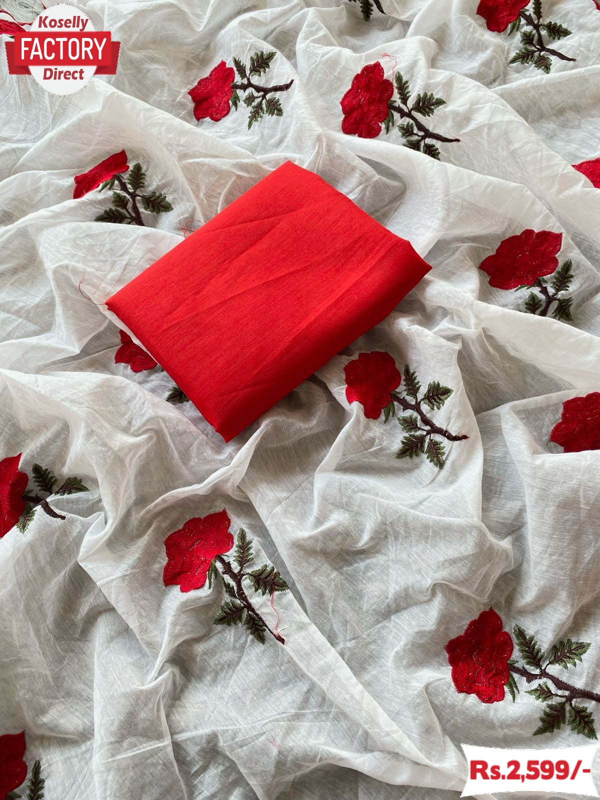 Pure Soft Chanderi Cotton With Red Rose Thread Work And Cutwork