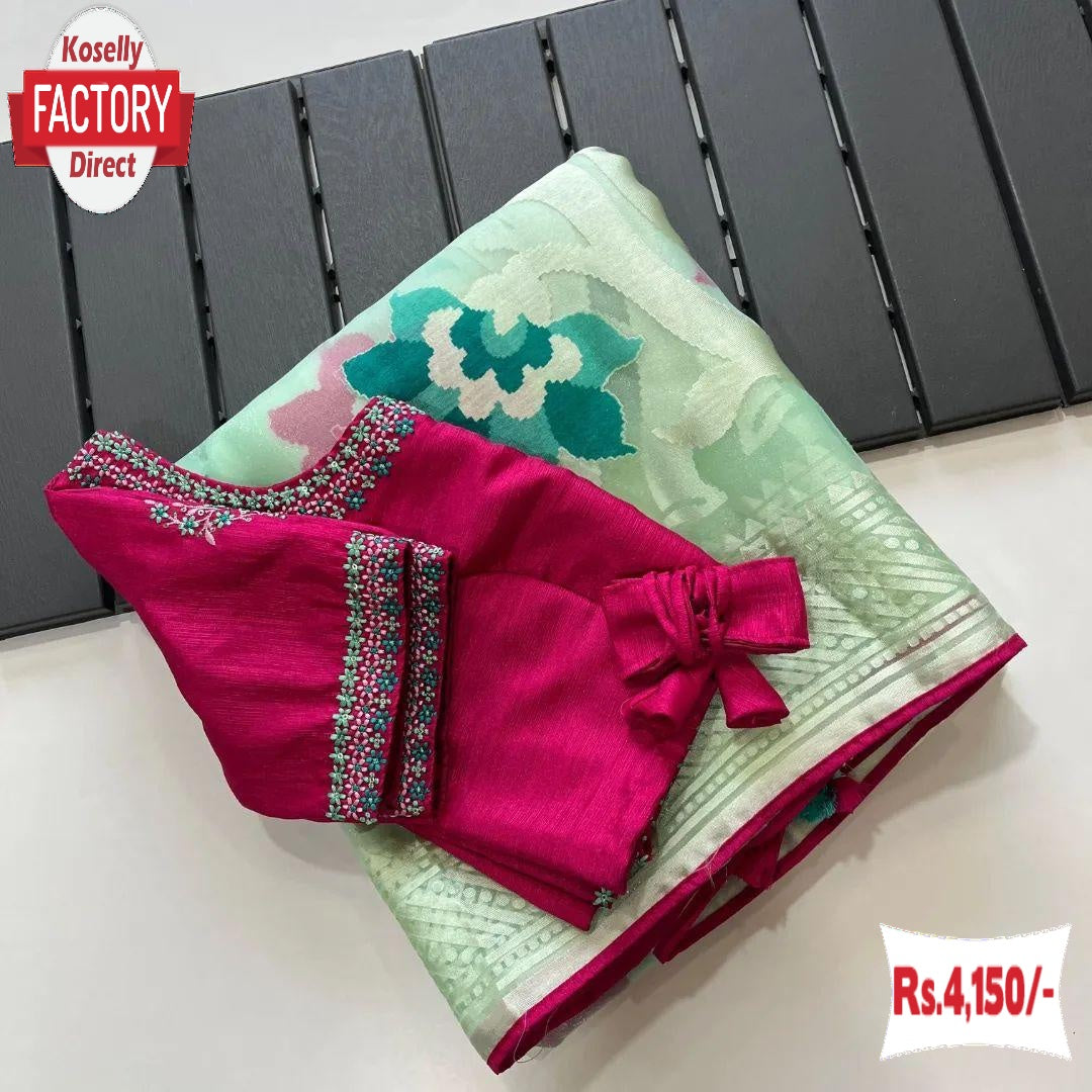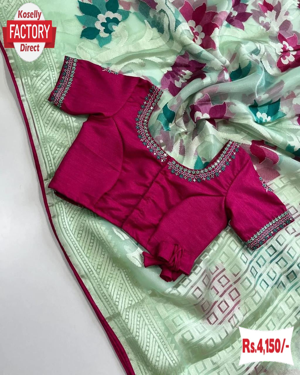 Stay cool and sophisticated in this faint green pure organza brasso partywear saree. This lightweight saree features softy organza fabric and a flowy fit, perfect for a comfortable look that won't sacrifice style. It boasts intricate multicolour Brasso work and a fabulous rich Brasso pallu, complemented by contrast piping and embroidered detail for the hands and neck on a chic un-stitched blouse.