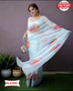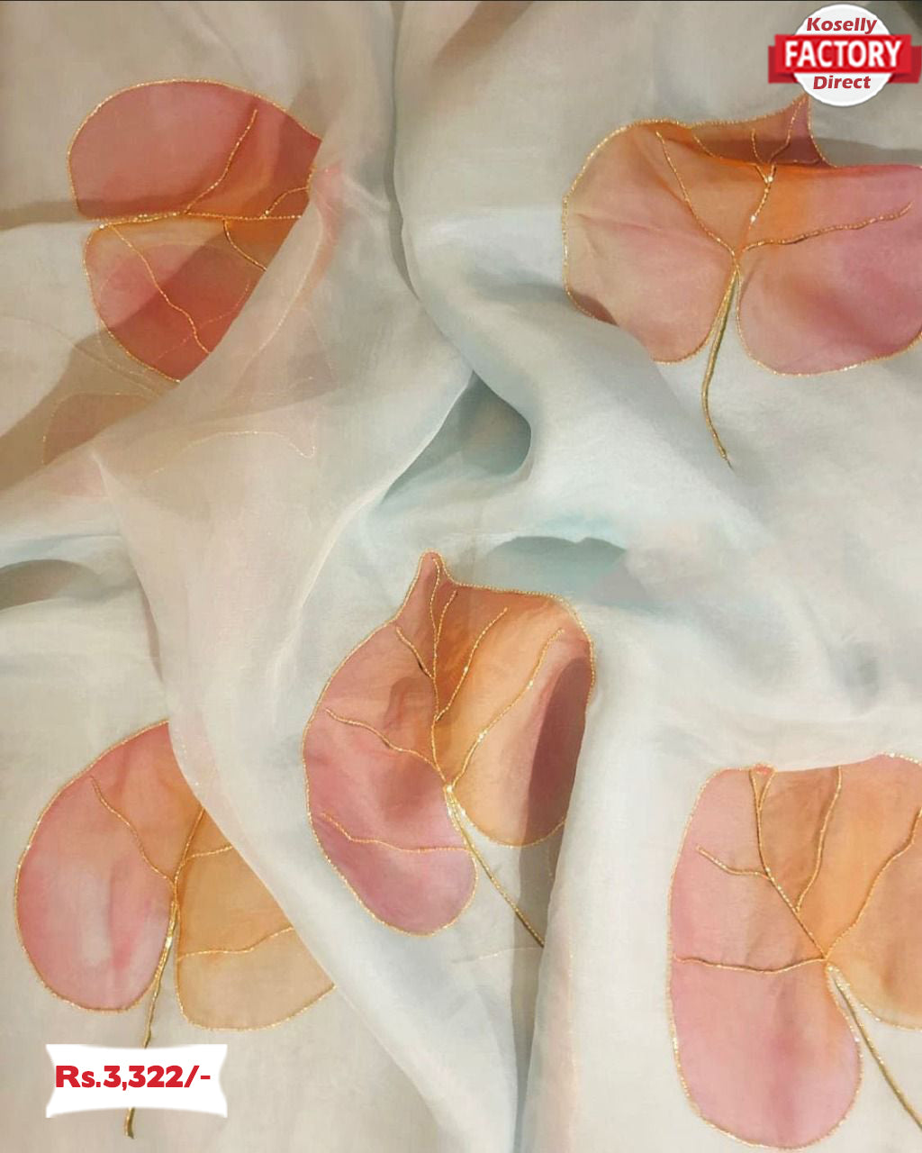 Light organza soft saree cover with beautiful handpaint flower all over saree with heavy katdana handwork all over saree touchup tikki border all over saree and matching satin blouse.