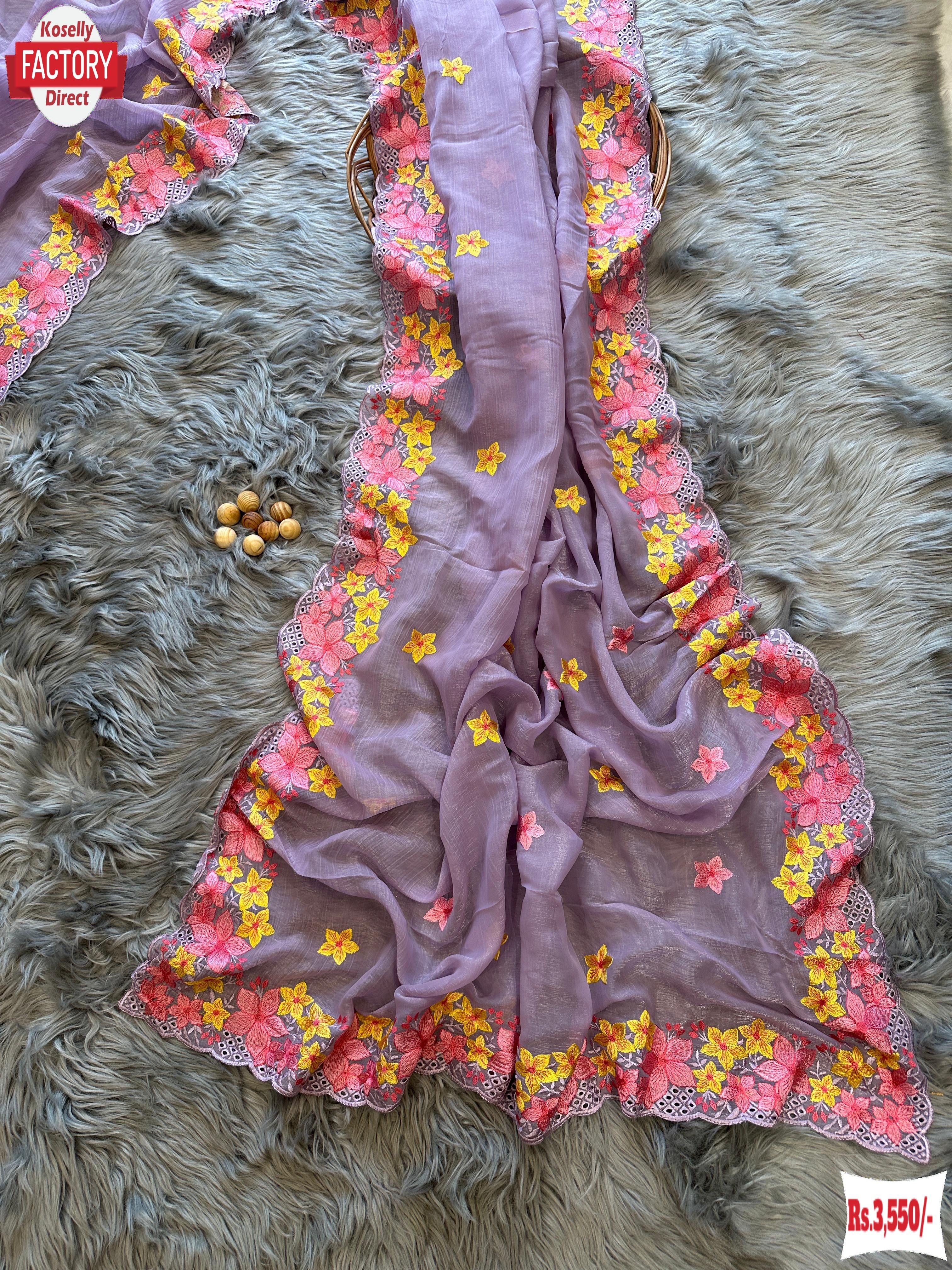 Elevate your party look with our Dusty Green Georgette Silk Saree. Crafted with intricate embroidery and cutwork border, this saree exudes elegance and grace. The soft Georgette silk fabric adds a luxurious touch while the running work blouse completes the ensemble. Make a statement and turn heads with this stunning saree.