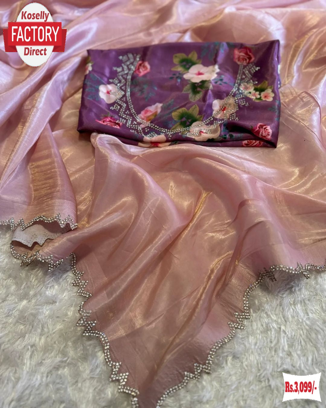 Experience luxury and elegance with our Jimmy Choo Silk Partywear Saree. This saree features stunning Sabyasachi designer diamond work, adding a touch of glamour to your look. The rich gold crushed shinning fabric is complimented by a royal flower print and diamond work blouse, making you feel like royalty.