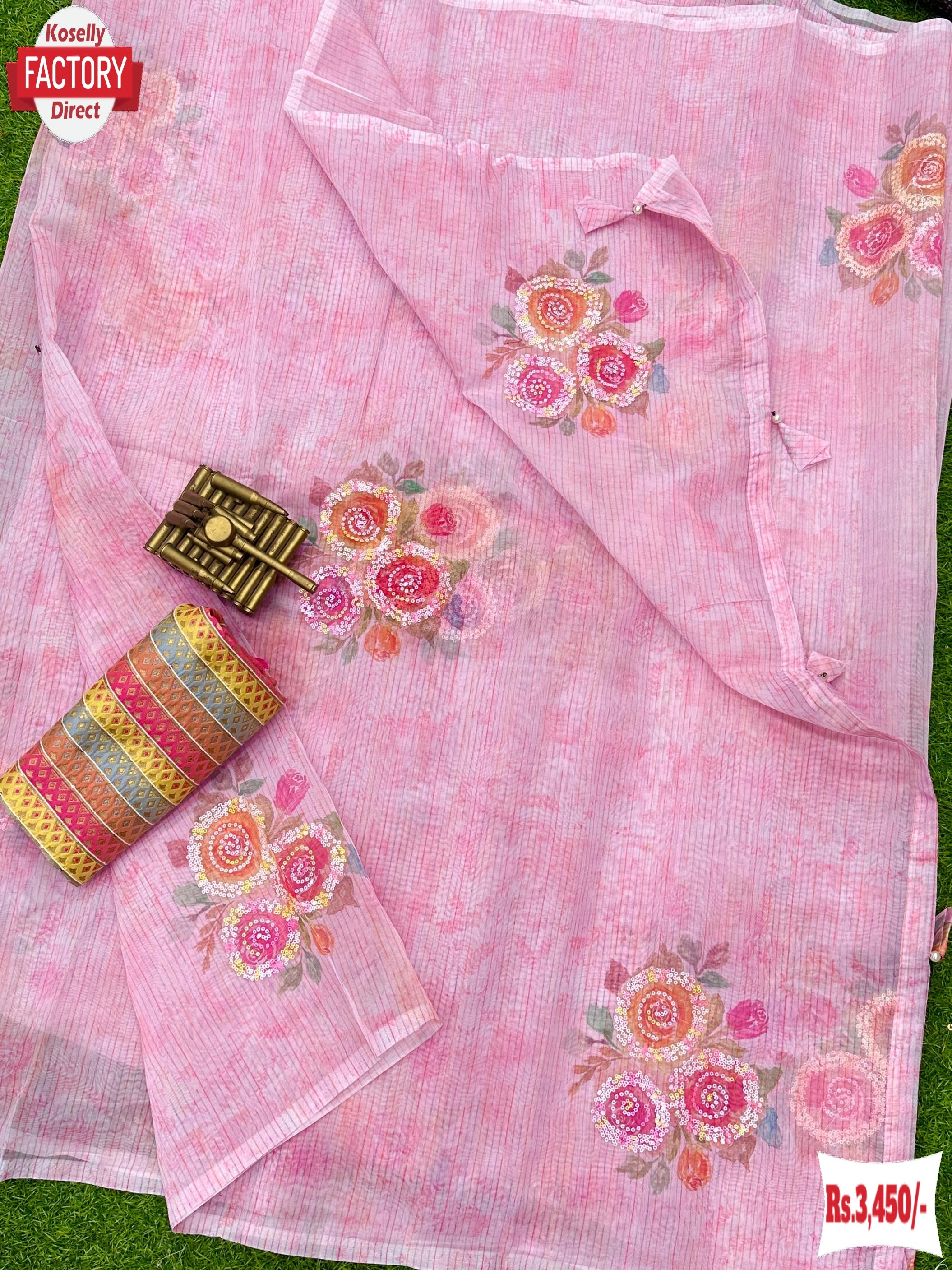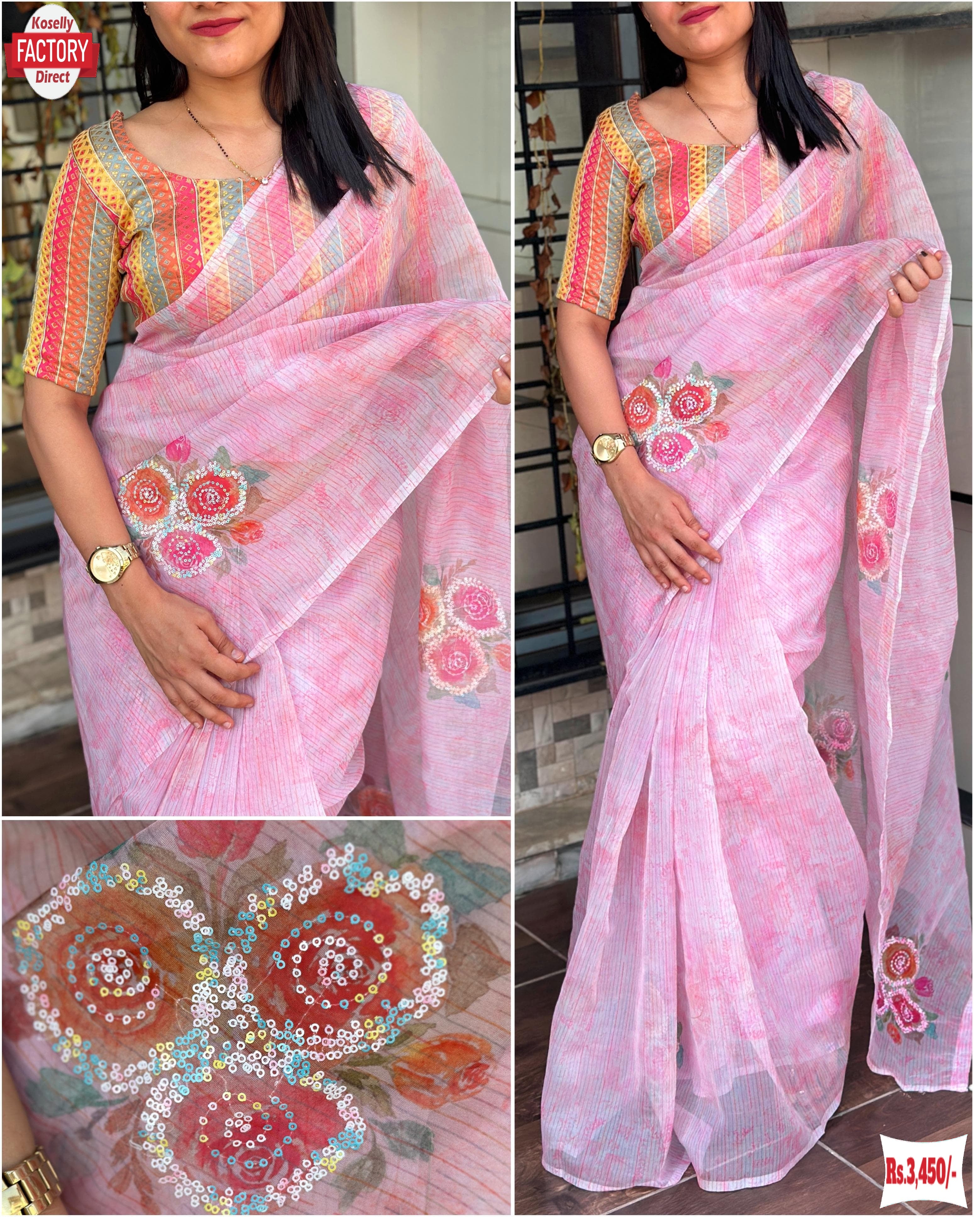 Get ready to rule the fashion jungle with our Soft Organza Multithread Embroidered Partywear Saree! Made with the softest organza fabric, this saree features a stunning 3D digital print with hand multi sequins work and tussle in the pallu. The contrast jacquard blouse, adorned with multi thread Minakari work, will make you feel like a queen. Weighting only 400g, you'll feel light and confident as you take on any challenge in this saree!