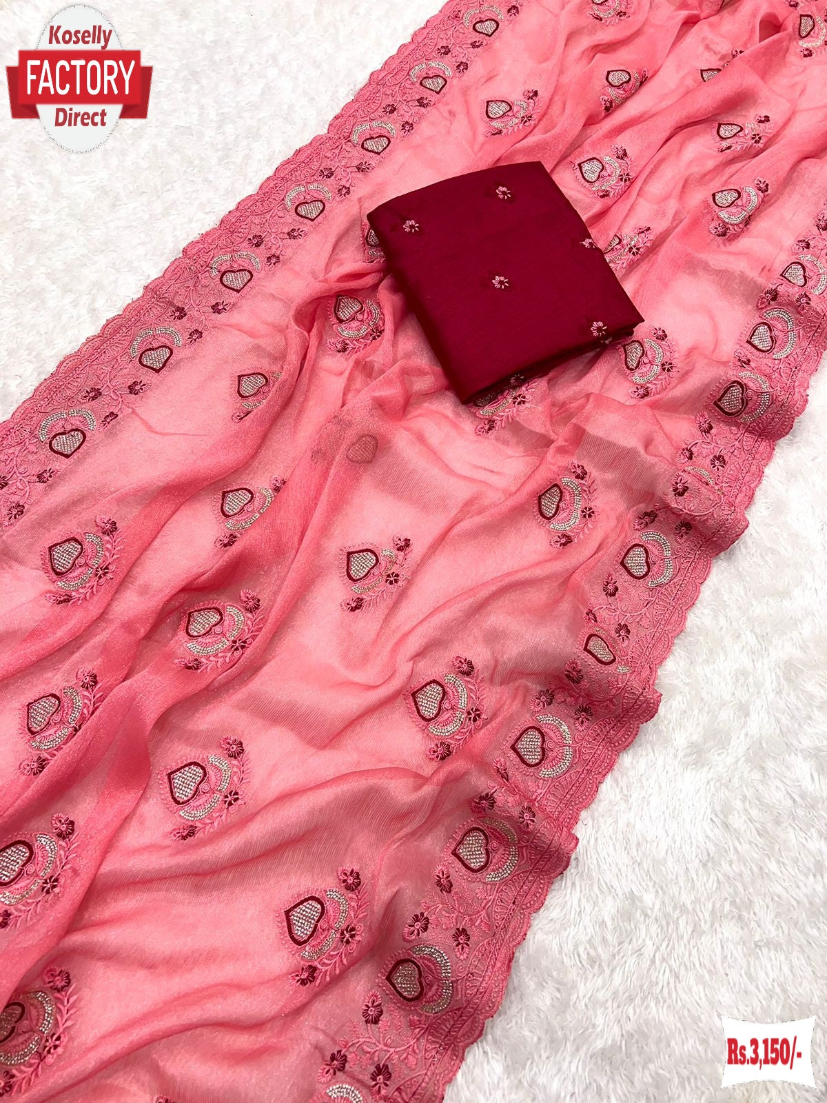 Punch Pink Shimmer Chiffon Embroidered Partywear Saree