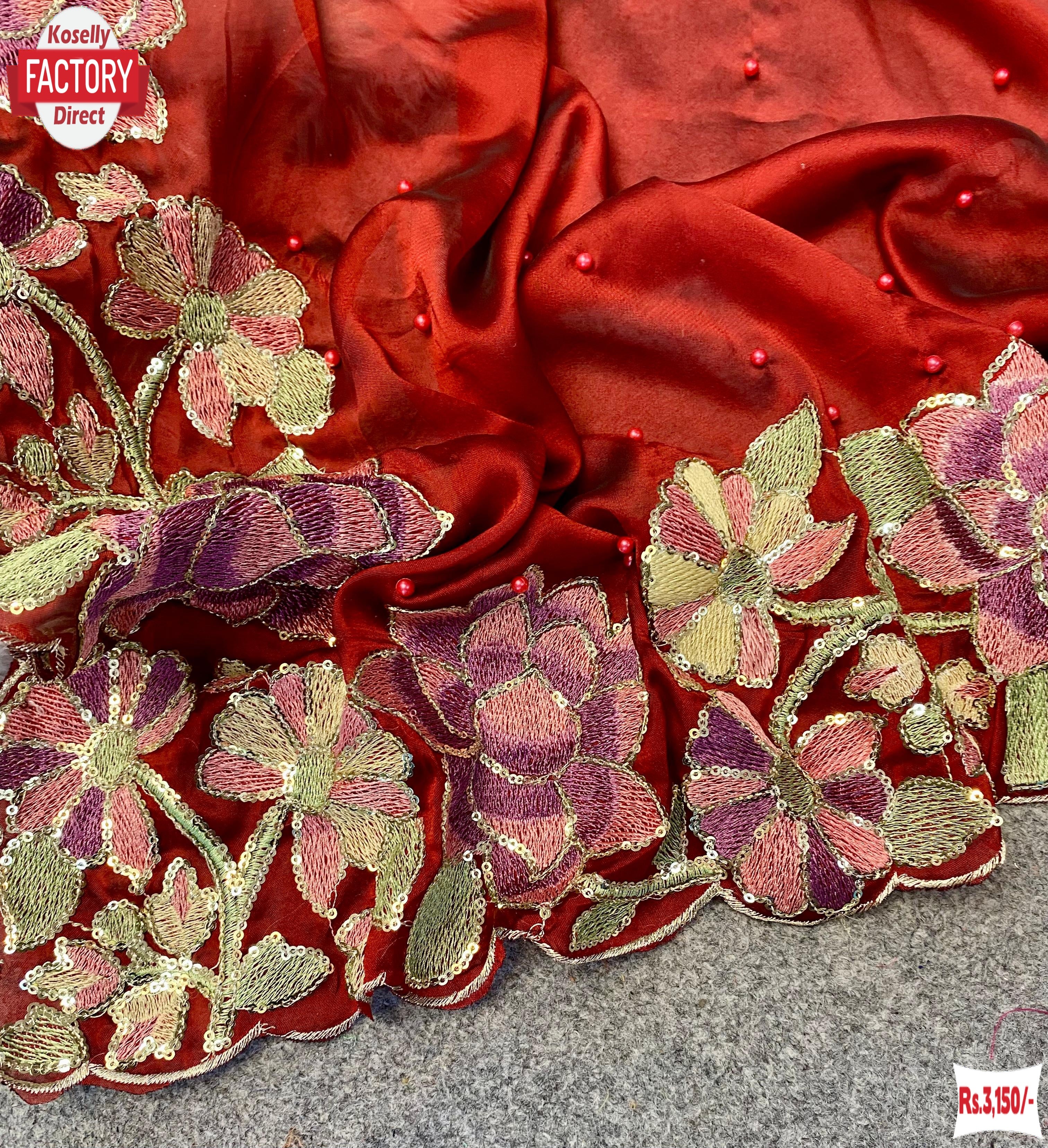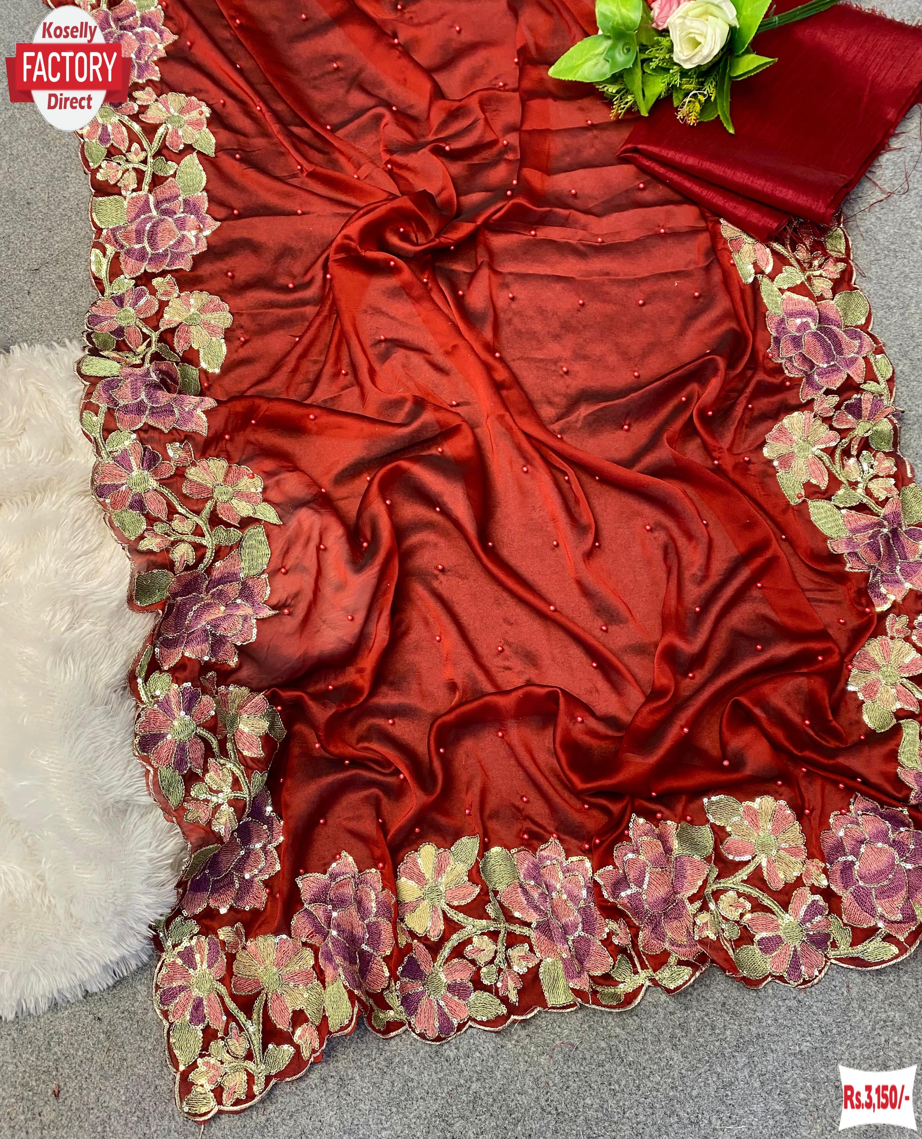 Pure soft rangoli shining silk fabric saree with flower multi colour thread and sequins flower outing in border and body stitch pearl tone to tone colour and paired with matching silk blouse.