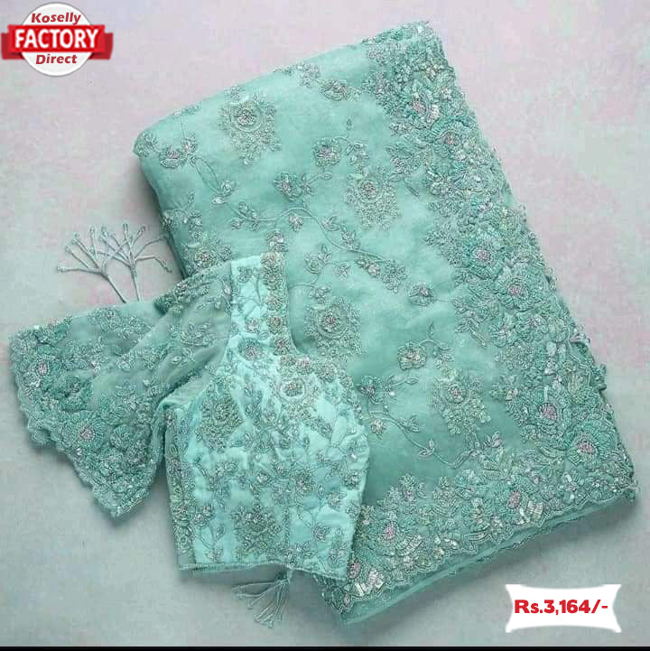 Saree : Organza with coding sequins embroidered work saree with cut-work 5.5 meter length. Coding sequins work comes in pallu and skirt as well.