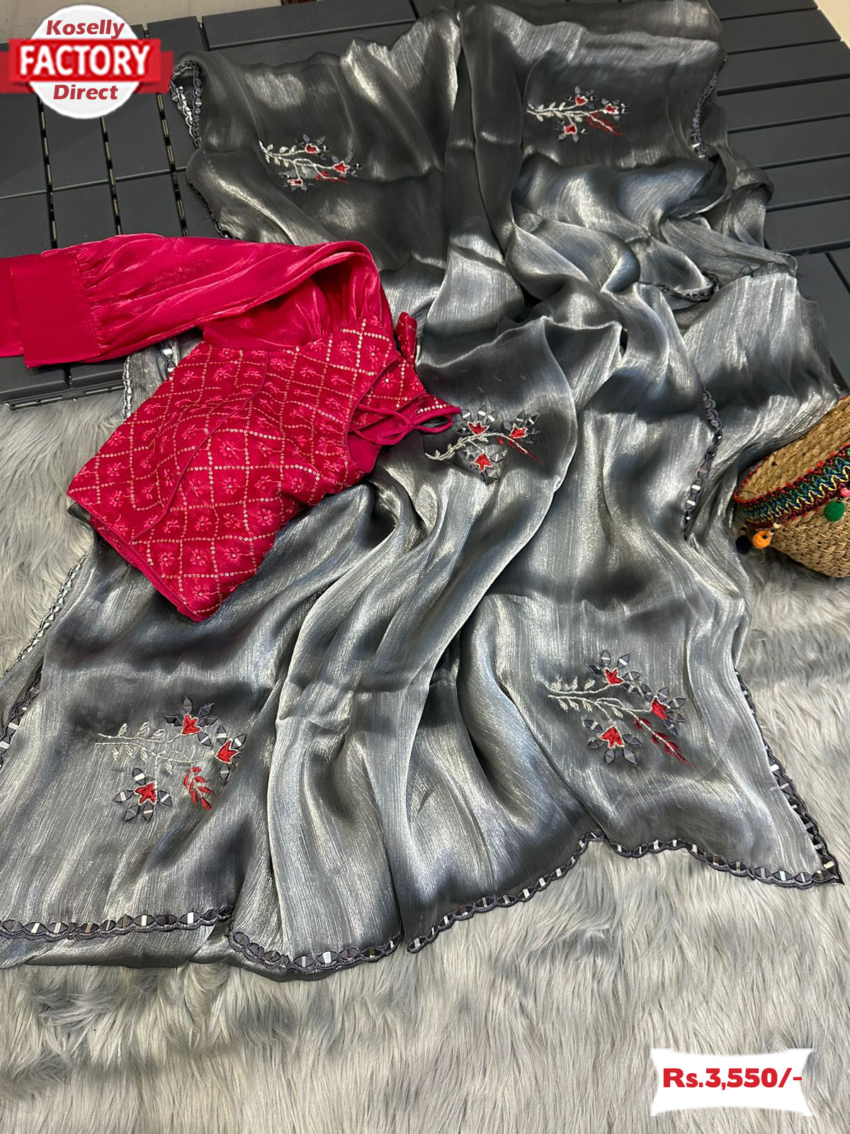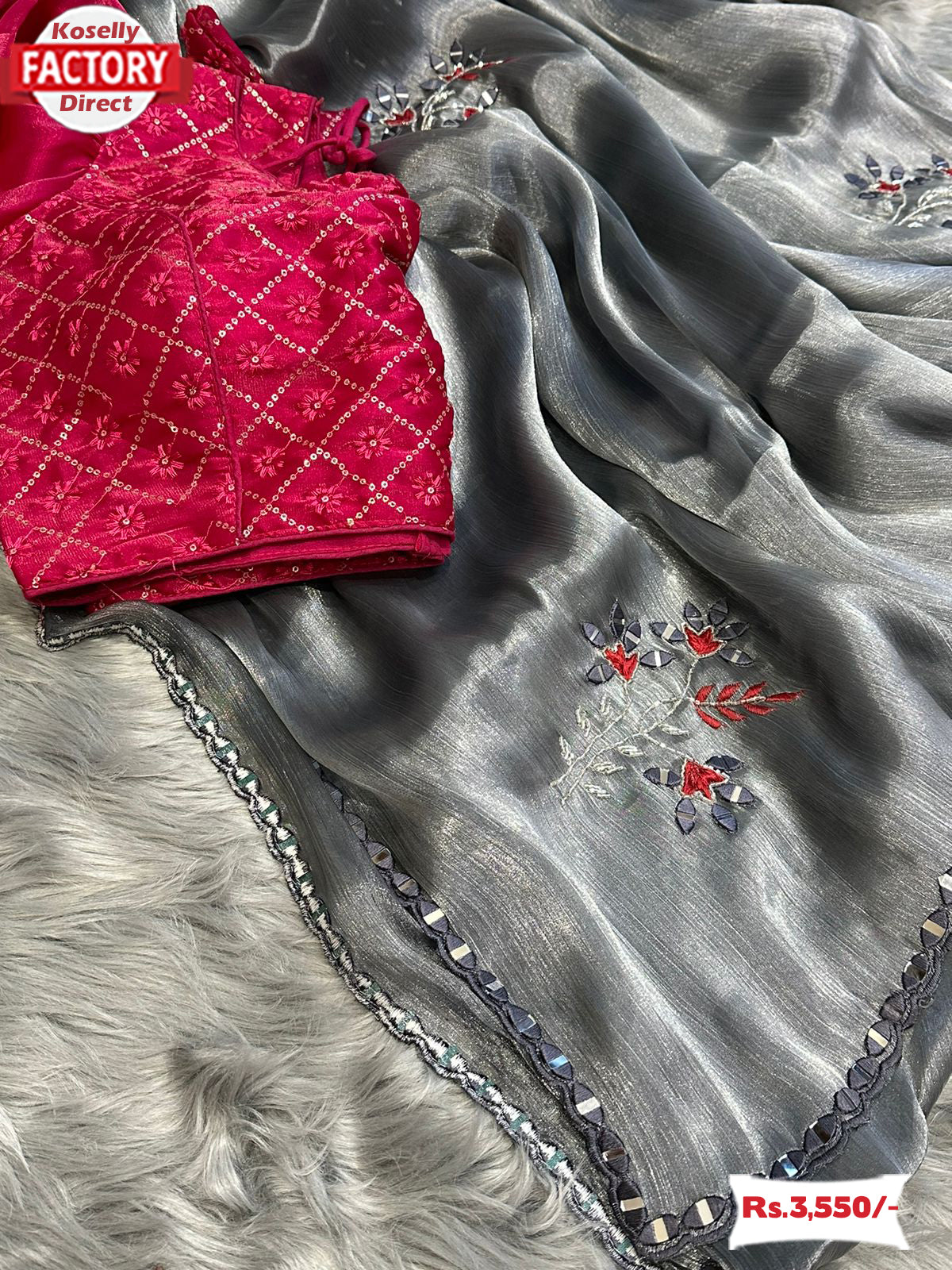 Pure Shimmer organza with beautiful handwork in all over saree also embellished with real mirror border in full saree. Comes with fully stitched sequins worked blouse.