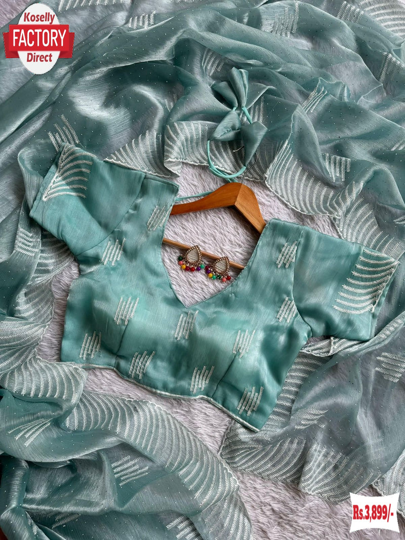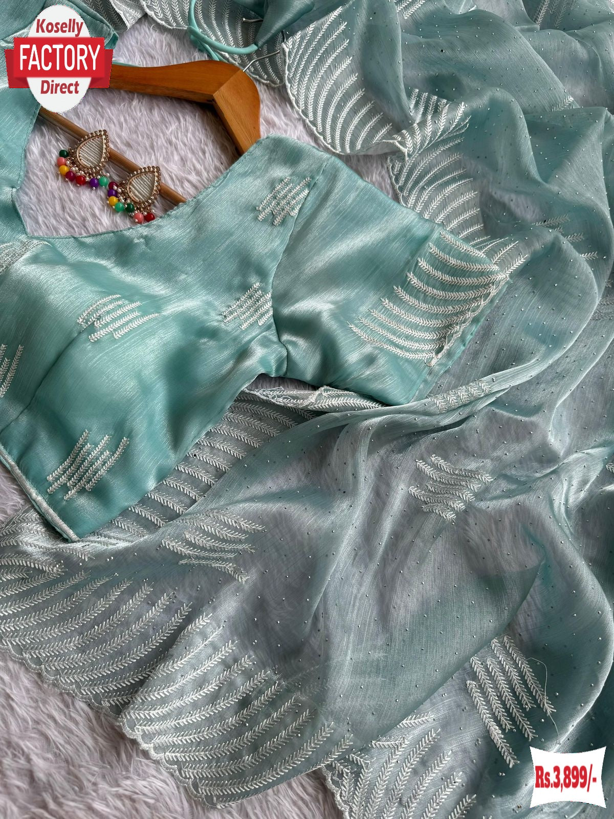 Sky Blue Jimmy Choo Silk Embroidered Partywear Saree With Readymade Blouse