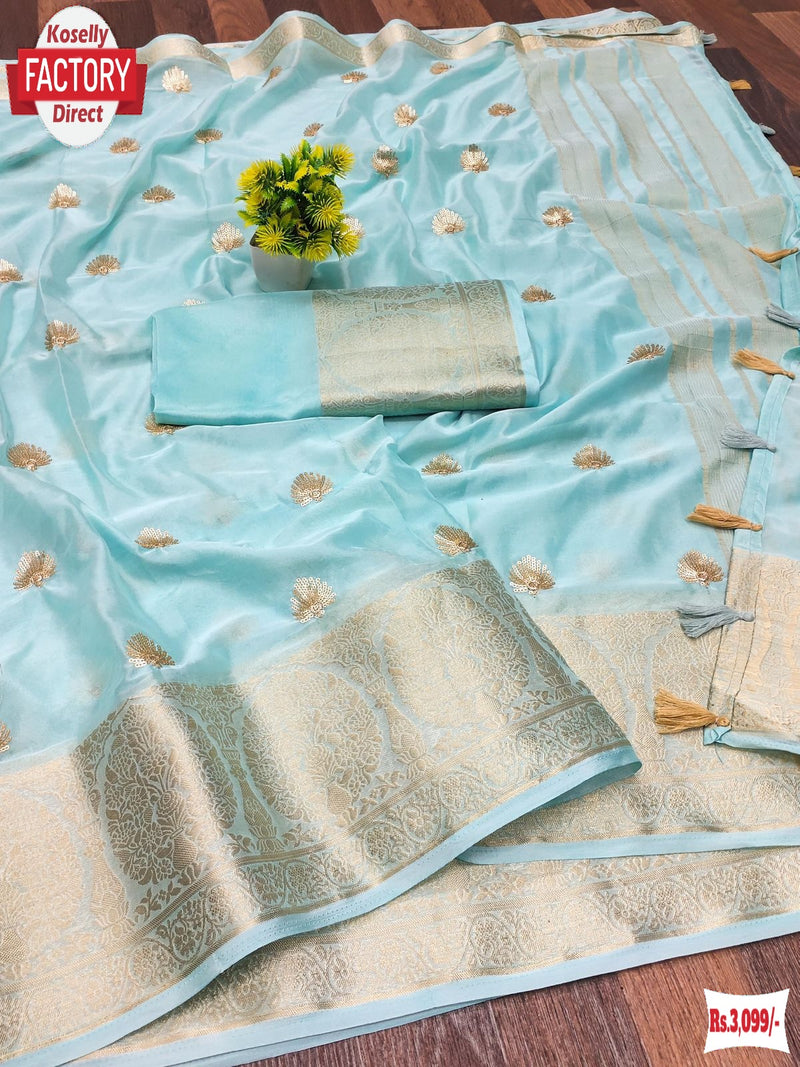 Sky Blue Pure Chinnon Crepe Silk Sequins Work Partywear Saree