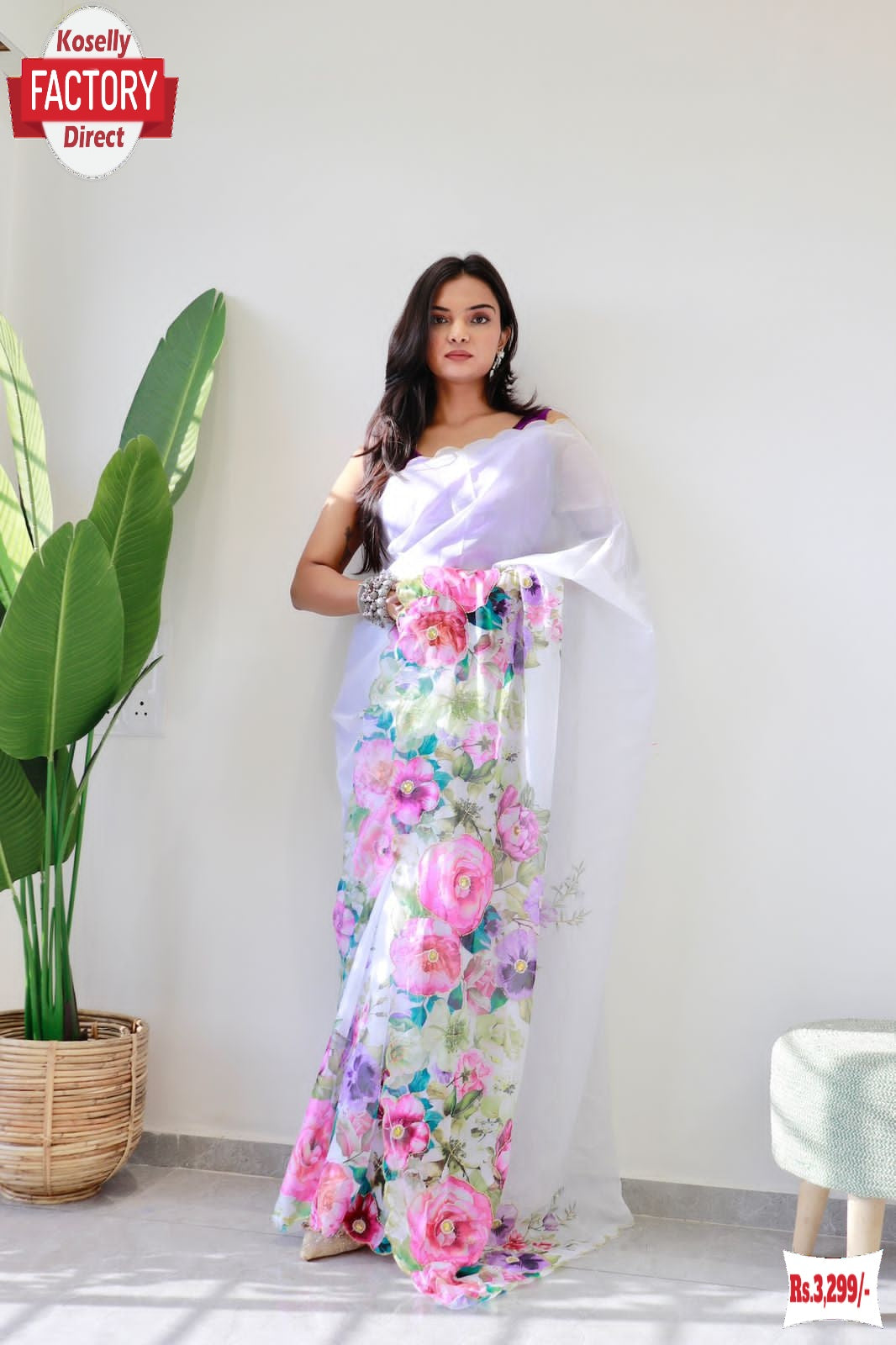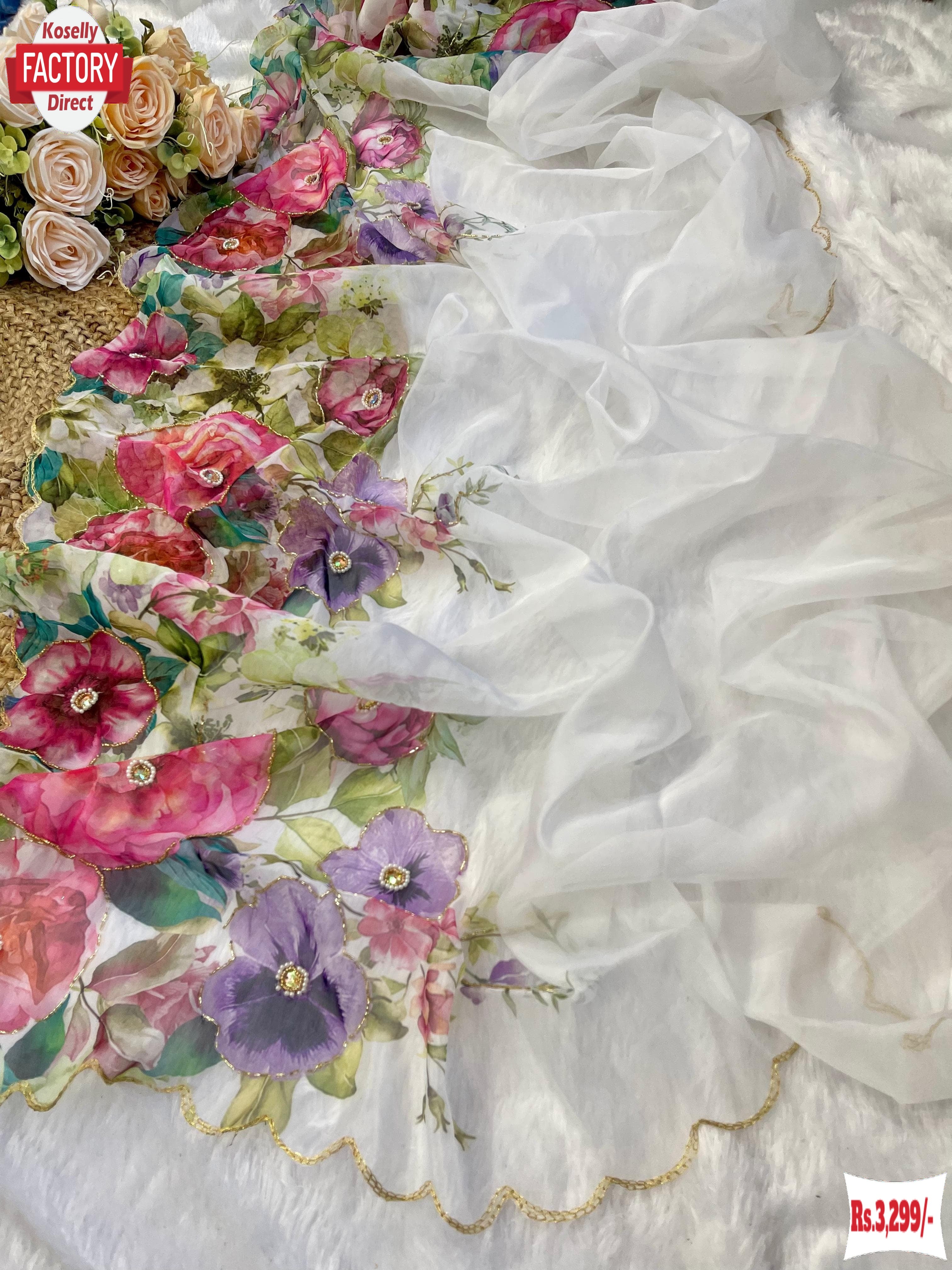 Wow the crowd with our White Pure Tabby Silk Partywear Floral Embroidered Saree. Made from pure soft tabby silk, this saree features stunning floral panel designs embellished with hand cutdana and stone work. Plus, the cutwork adds a touch of elegance. Comes with an unstitched mono silk blouse for a perfect fit. Get ready to turn heads at your next party!