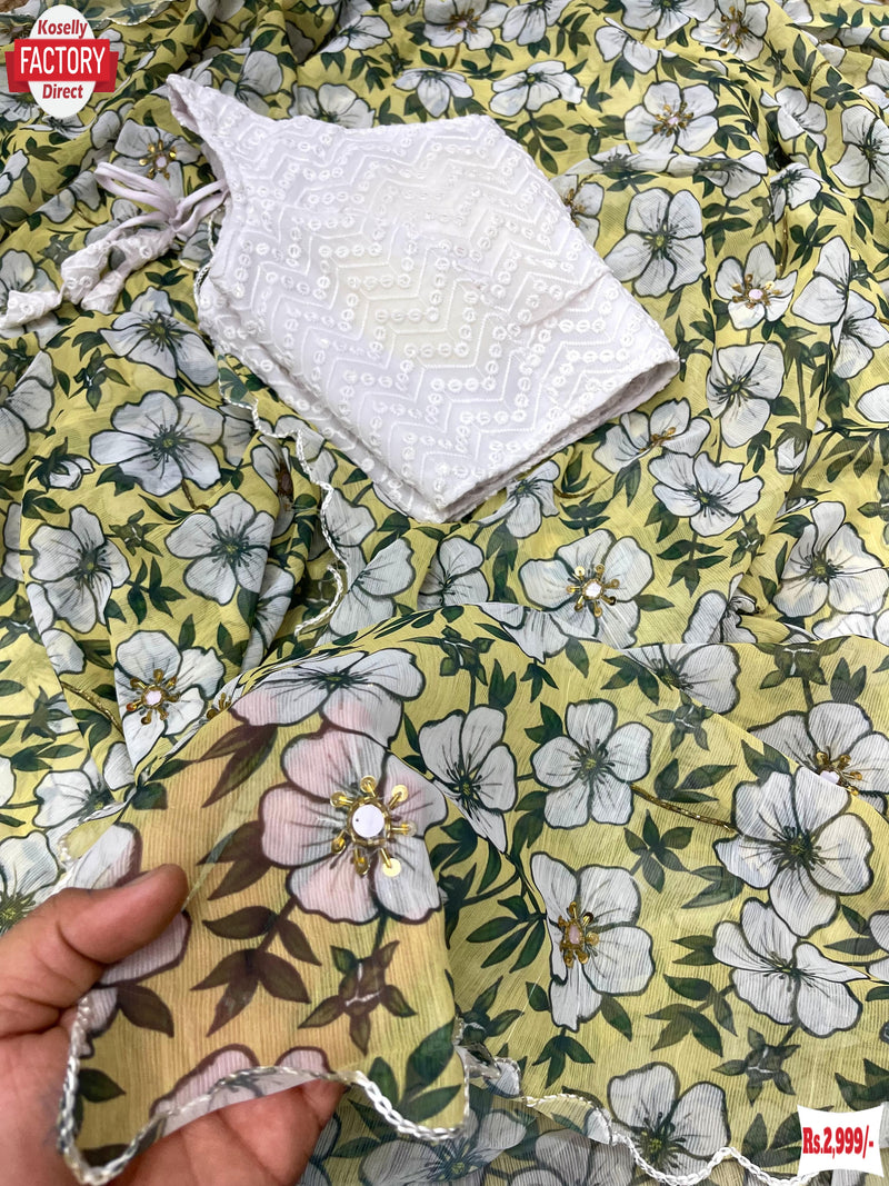 Get ready to turn heads at any party with our Pure Soft Chiffon Silk Partywear Saree. Made from pure soft chiffon silk, this saree features stunning floral prints and intricate khatli buttis all over, adorned with beautiful handwork. Make a statement with the paired fully stiched worked blouse. Elevate your party look with this elegant saree!