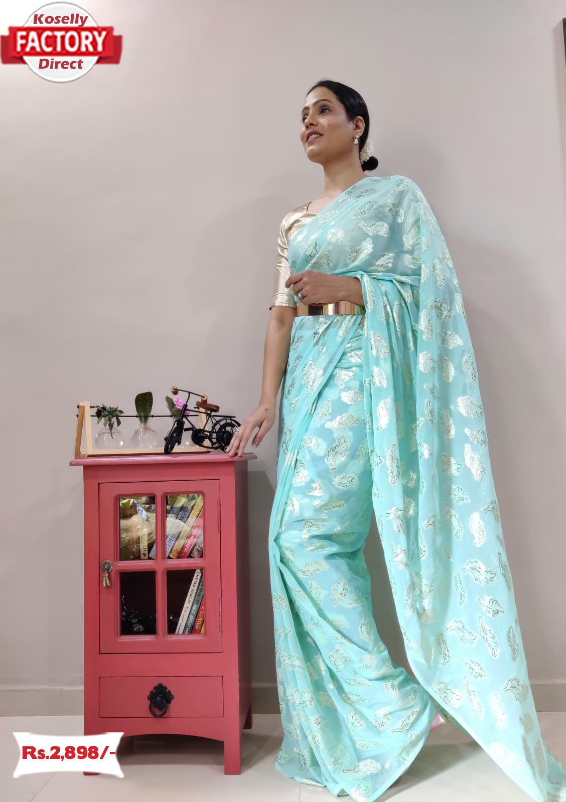 Sky Blue Viscose Zari Ready To Wear Saree With Belt