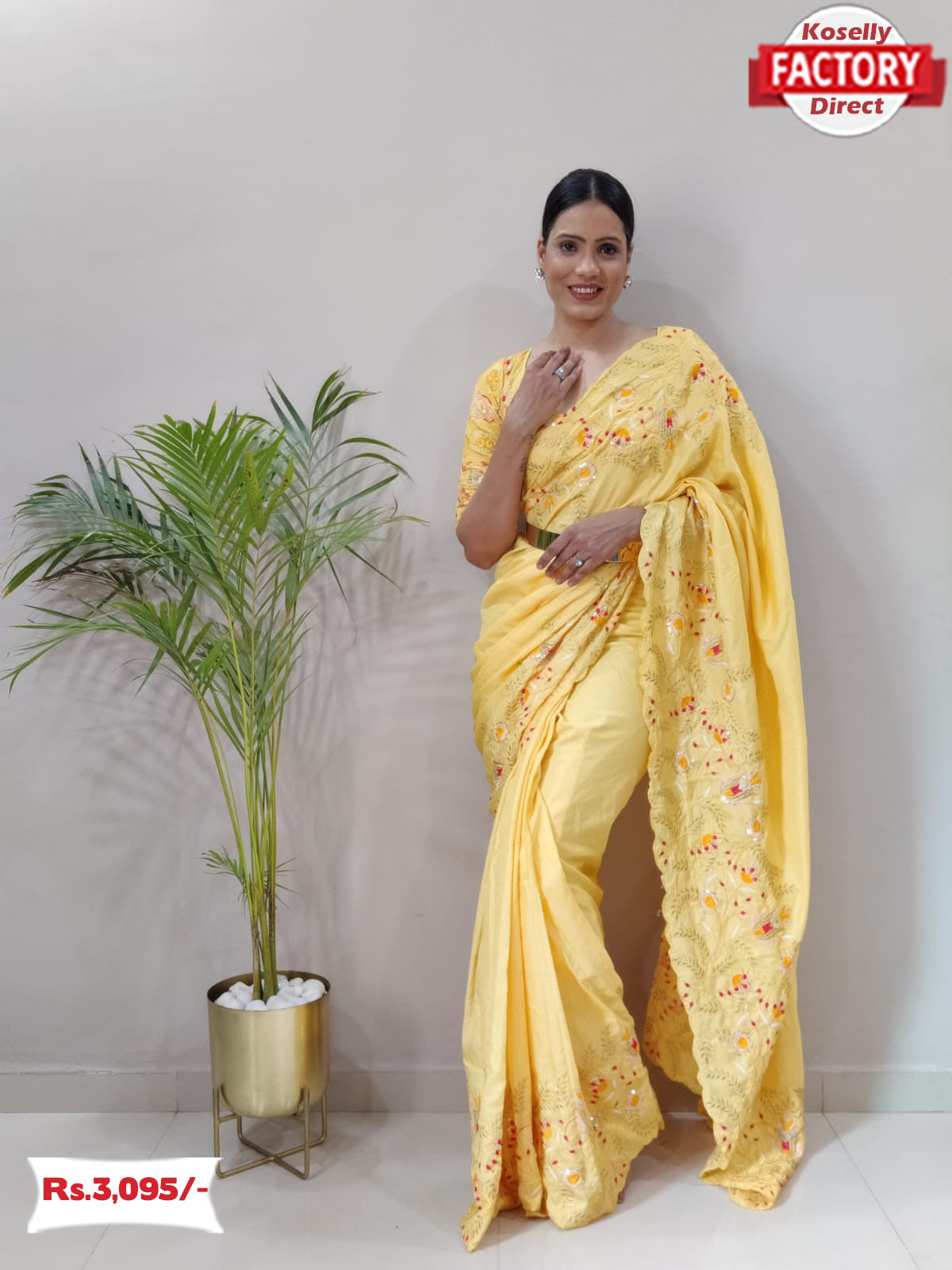 Saree : Premium Dola Silk Embellished With Beautiful Heavy Embroidery And Beautiful Sequins Work ( Ready To Wear )