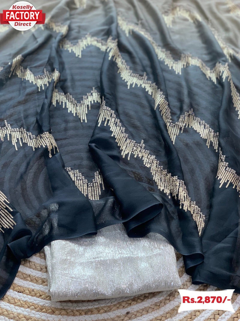 Beautiful padding silk saree with beautiful glitter sequins cover with tone to tone embroidery attached with latkan and silver gota work blouse.