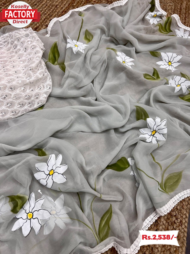 *Chiffon silk saree with handprint in saree with beautiful border of Chikankari lace also attached with Chikankari sequins blouse of Georgette fabric *🍁🌺