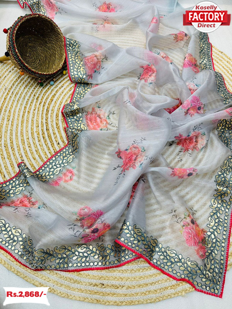 Beautiful khadi organza saree with  floral digital print, viscose gota thread work with beautiful thread border line paired with pretty Raw silk blouse.