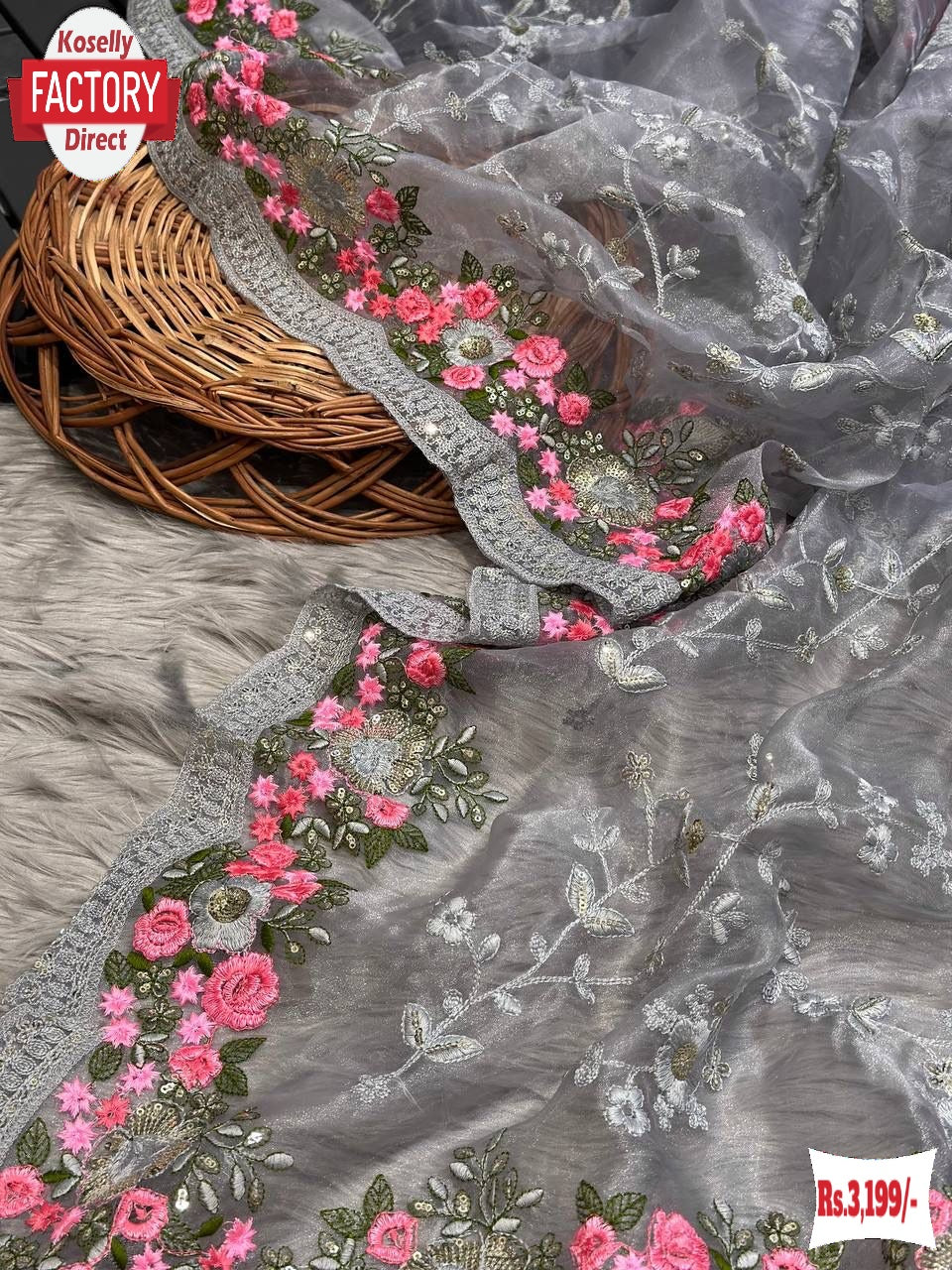 Ash Organza Silk Sequins Embroidered Partywear Saree