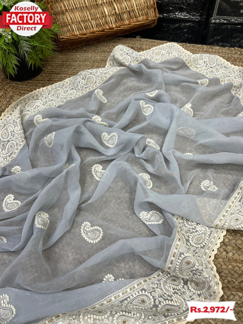 Ash Shimmer Silk Saree With Chikankari Work