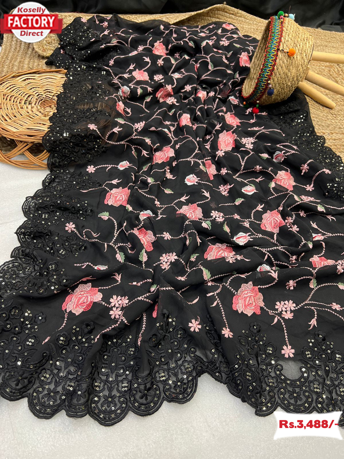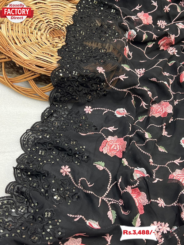 Pure georgette silk saree enhanced with sequins work and multiple thread work of viscose colors. Comes with satin blouse. Perfect drape for a rich and luxurious look and feel.