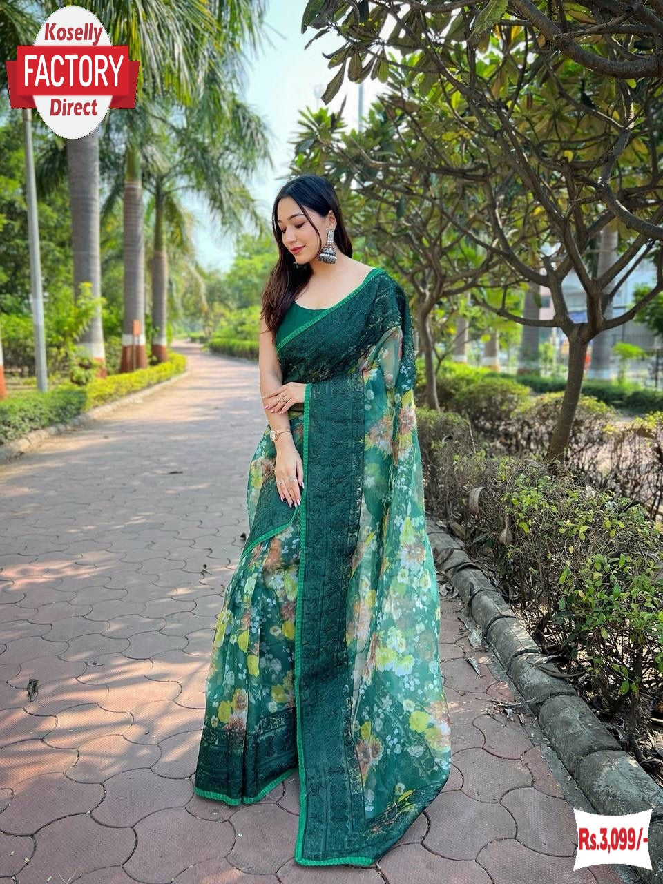 Dark Green Organza Chikankari Digital Printed Fancy Saree