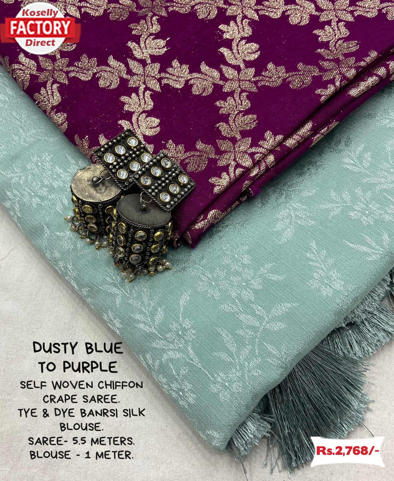 Dusty Blue Chiffon Crepe Saree With Purple Blouse Piece