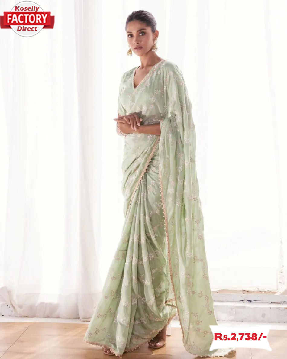 Dusty Green Faux Georgette Embroidered Partywear Saree