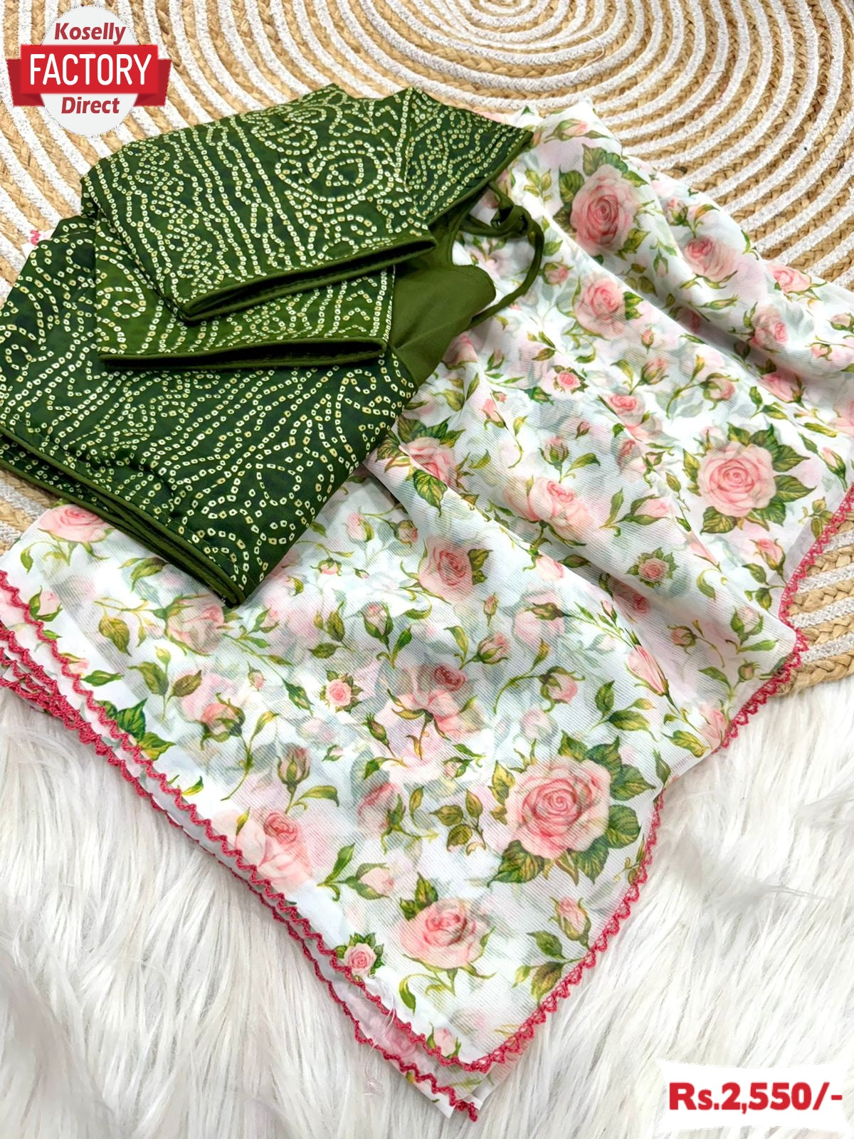 Green And White Pure Chiffon Saree With Stitched Blouse