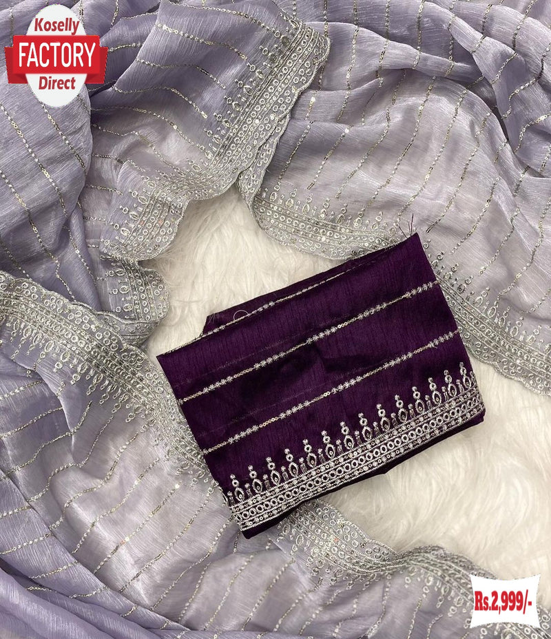Be the life of the party in this Jimmy Choo Silk Partywear Saree! Made of luxurious Burberry zimmy choo silk, this saree boasts an eye-catching C Pallu sequins work and a stunning Cut-work border. Paired with a Havy Mono Silk blouse featuring intricate embroidery work, this saree will make you stand out in any crowd.