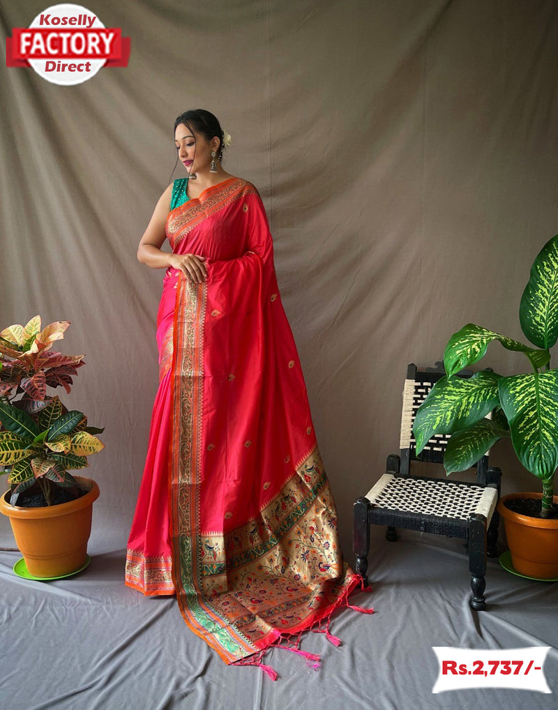Soft Paithani Silk Sarees with Peacock Meenakari Small Zari Weaving Motifs all over with Contrast Weaving Border and Meenakari Contrast Paithani Pallu