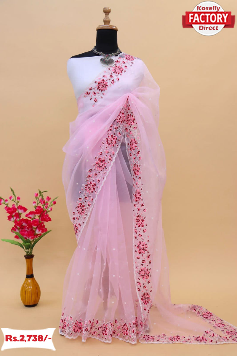 Pure organza saree with colourful embroidery all over motif embroidery in border arco cutting and contrast silk blouse.